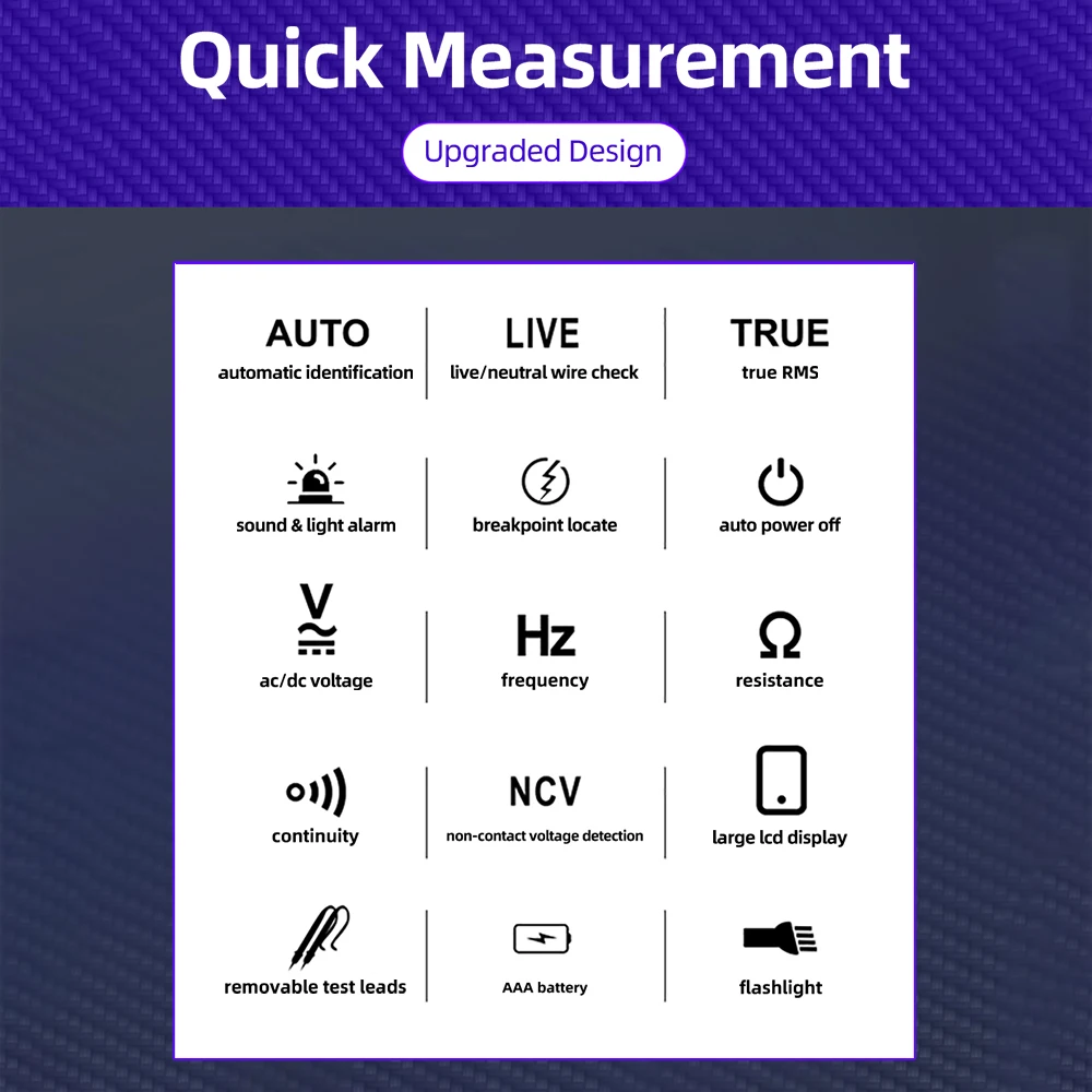 BSIDE X1 тестовый карандаш имеет двойной режим обнаружения, т. Е. Высокая/низкая чувствительность NCV обнаружения. Это также мультиметр, который может измерять напряжение переменного/постоянного тока, сопротивление, частоту, определить нейтральный/живой провод и провести непрерывный тест. Карманный размер с большим ЖК-экраном, он прост, удобен и безопасен в использовании. Особенности: Высокая/низкая чувствительность NCV режим обнаружения обеспечивает безопасное измерение и отвечает требованиям различных приложений. Многофункциональный измеритель, который может отличить нейтральный провод от живого провода, непрерывность тестовых замыканий, найти точку разрыва в живом проводе и измерить напряжение, сопротивление, частоту переменного/постоянного тока. Обеспечивает звуковой сигнал и светильник одновременно при обнаружении напряжения и соответствует стандарту CAT 600 600V для обеспечения максимальной безопасности. Встроенный светодиодный фонарик позволяет удобно использовать в ночное время или в темном уголке. Оснащен ультрапрозрачным ЖК-дисплеем EBTN, четким и удобным для чтения. Компактный и портативный дизайн позволяет легко использовать, удобный инструмент для электрика, а также отлично подходит для непрофессиональных, чтобы использовать дома. Характеристики: Материал: АБС-пластик Бренд: BSIDE Модель: X1 Максимальный дисплей: 2000 шт. Измеритель Толщина: 1,5 см. Макс. Напряжение постоянного тока: 600 В 0,01 В ±(0.8% + 3) Макс. AC Напряжение: 600V 0,01 V ±(1.2% + 5) Сопротивление: 10 МОм 1 Ом ±(1.2% + 3) Частота: 40 Гц ~ 1000 Гц 1 Гц ±(2.0% + 3) Режим обнаружения NCV: 90V ~ 1000V AC Высокочувствительный режим обнаружения NCV: 6V ~ 1000V AC Идентификация в режиме реального времени/нейтральная Идентификация: звуковой сигнал тревоги, полоса ЖК-дисплея Тест на непрерывность: если сопротивление менее 30 Ом, звуковой сигнал Батарея тест: 1,5 V/6 в/9 В/12 В Автоматическое выключение: 5 минут Источник питания: 2 батарейки ААА (не входит в комплект) Размер изделия: 160*30*25 мм/6,29*1,18 * 0.98in Вес изделия: 69 г/2,43 унций Вес посылка: 215 г/7,58 унций Размер посылка: 17,6*8,2*4,2 см/6,92*3,22*1,65 дюймов Упаковочный лист: 1 * X1 детектор напряжения 1 * Портативная сумка для хранения 1 * Тестовые провода 1 * Руководство пользователя (на английском языке)