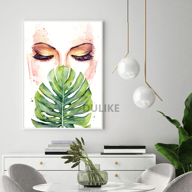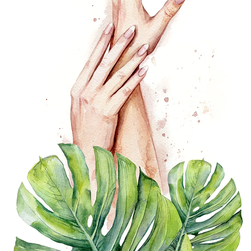 ThemeAbstract Watercolor Girl Face Hands Leaves Canvas Print