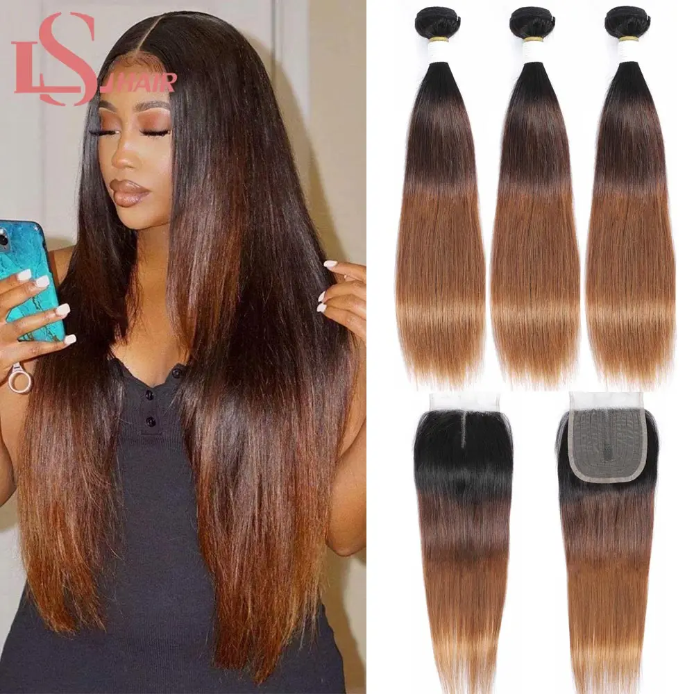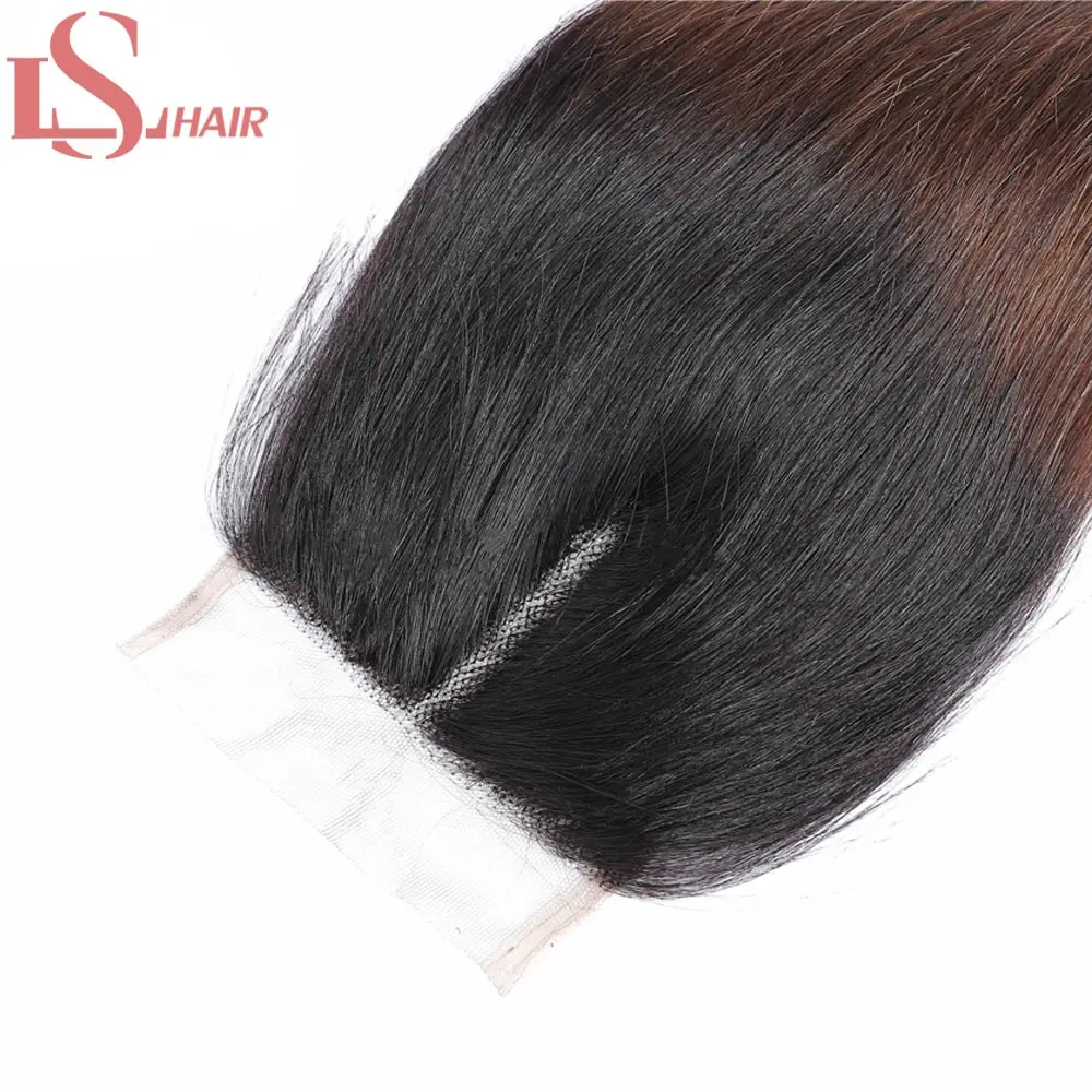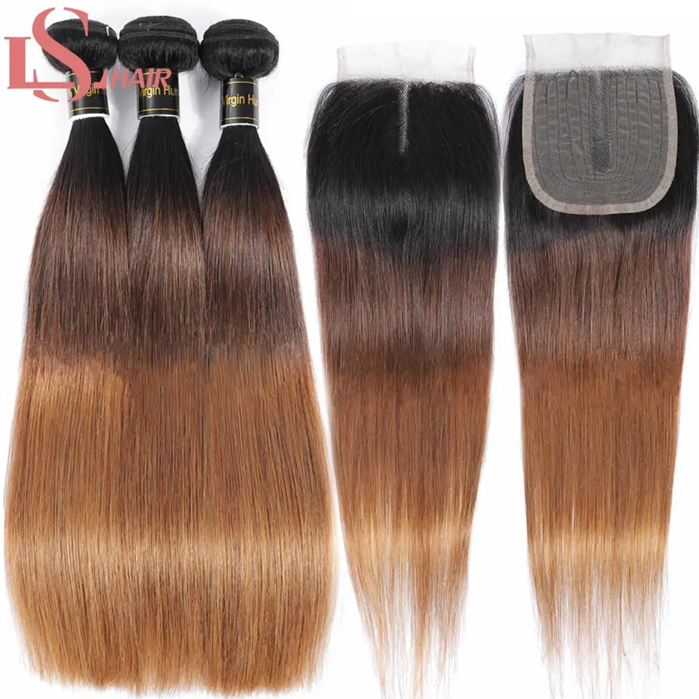 Пряди бразильских волос LS, волнистые, с закрытием, прямые человеческие волосы с эффектом омбре, 3 пряди с кружевной застежкой 4x4X1, 1B430 Реми