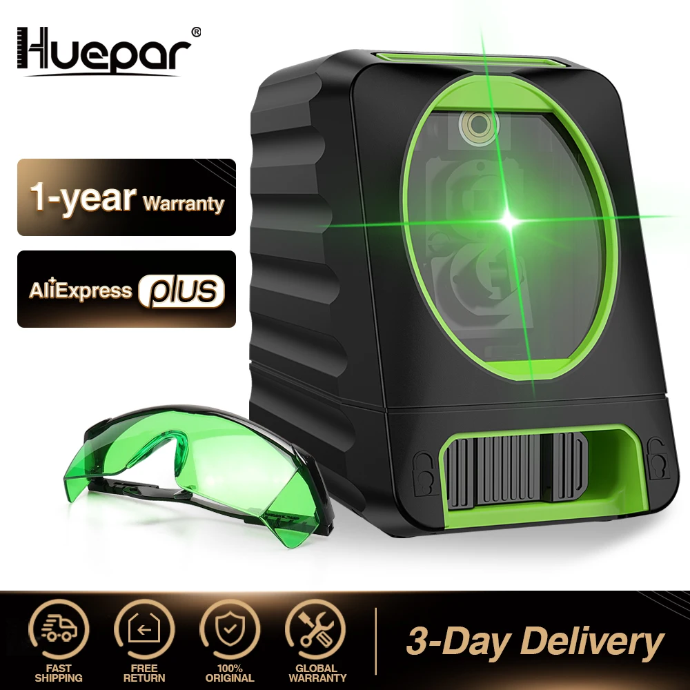 Самовыравнивающиеся вертикальные и горизонтальные лазеры Huepar, зеленый луч, перекрестные линии, лазерный уровень 150 градусов + Лазерные очки Huepar