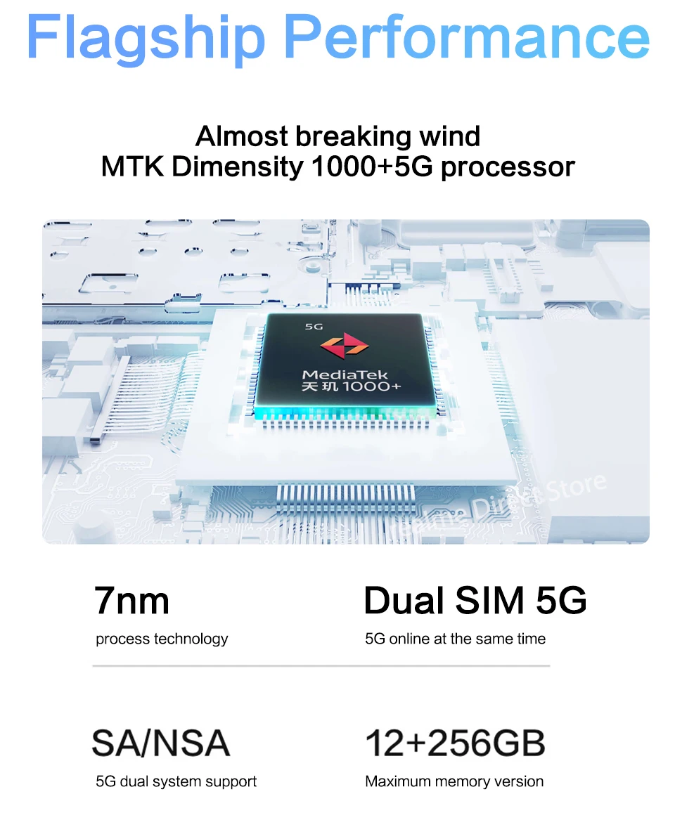 Процессор MTK Dimensity 1 000 + 5GВерховный флагман, ядро скрытого флагмана-«Бог года». Восьмиядерная архитектура, 7 нм процесс, создание неожиданного процессора. Встроенный чип 5G поддерживает более продвинутую двойную карту 5G, обеспечивая всесторонний опыт работы с 5G.