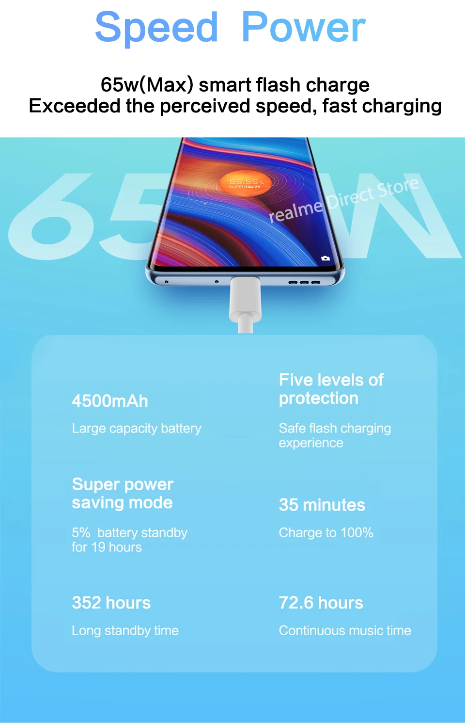 Это революция в скорости, не нужно ждать зарядки, сейчас зарядка вспышки. Он относится к самой быстрой технологии зарядки realme, сверхвысокой мощности зарядки 65 Вт, быстрой зарядки мобильных телефонов. Пятимерная вспышка для зарядки в реальном времени, Двойная Батарея Безопасности 3C сочетание батарей, обеспечивает сверхбезопасную зарядку.