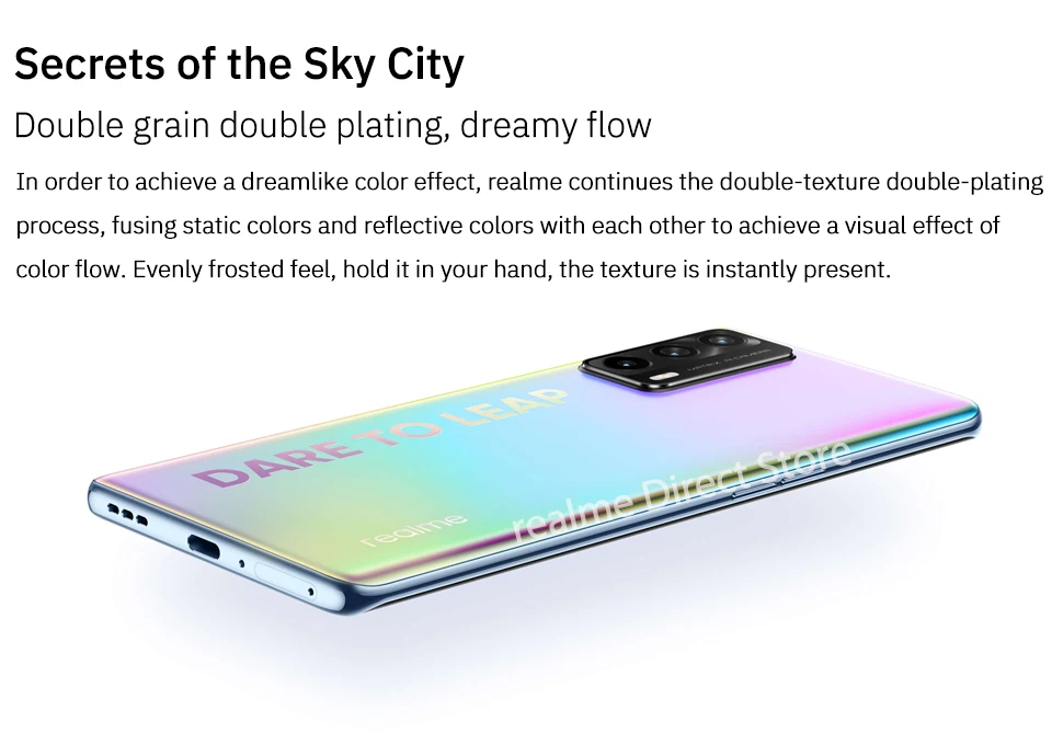 Для достижения эффекта сказочного цвета realme продолжает двойное покрытие с Двойной ТекстуройПроцесс, слияние статических цветов и светоотражающих цветов друг с другом для достижения визуального эффектаЦветовой поток. Равномерно матовое ощущение, держите его в руке, текстура мгновенно появится.