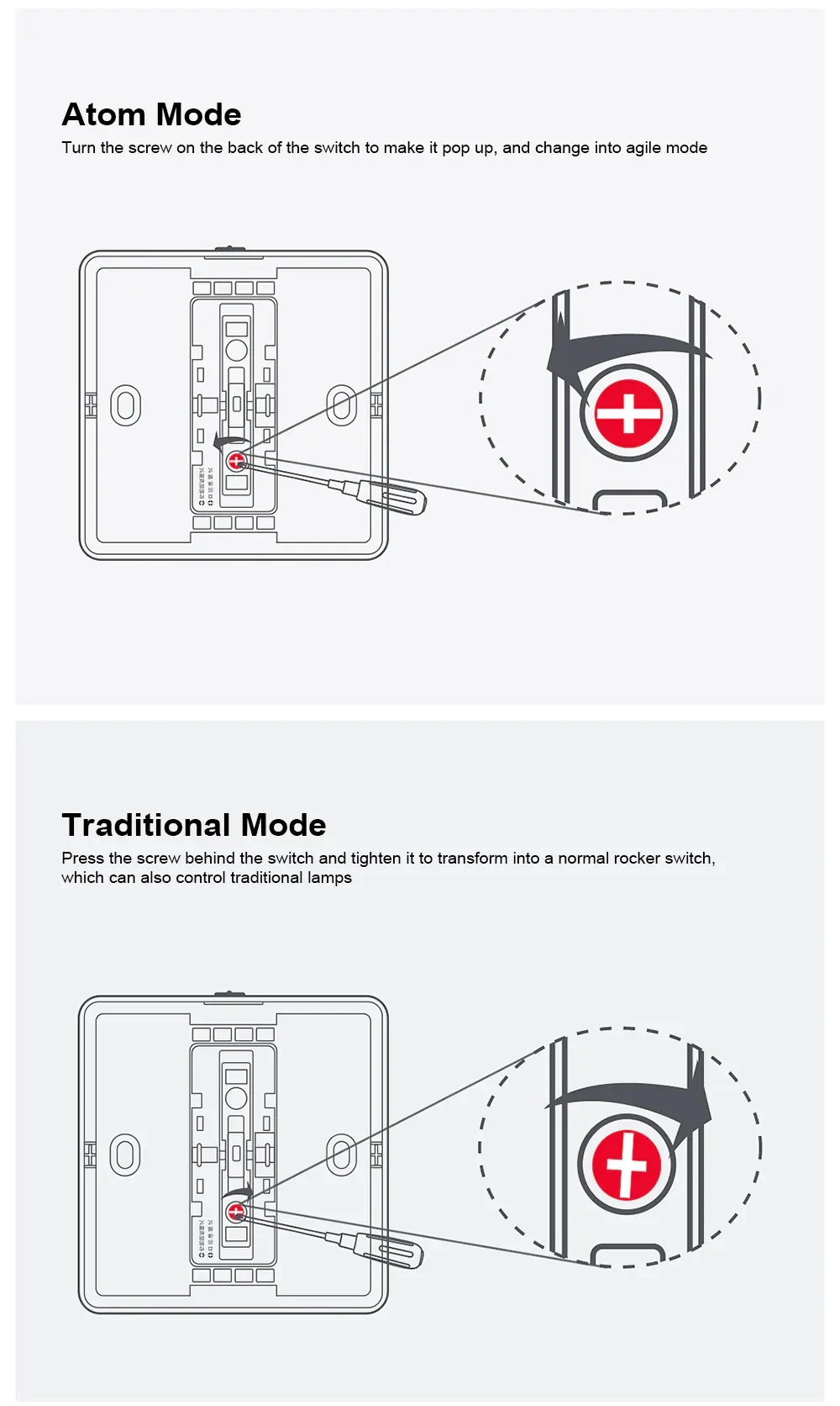 Нажмите винт за переключателем и затяните его, чтобы преобразиться в обычный кулисный переключатель, который также может управлять традиционными лампами