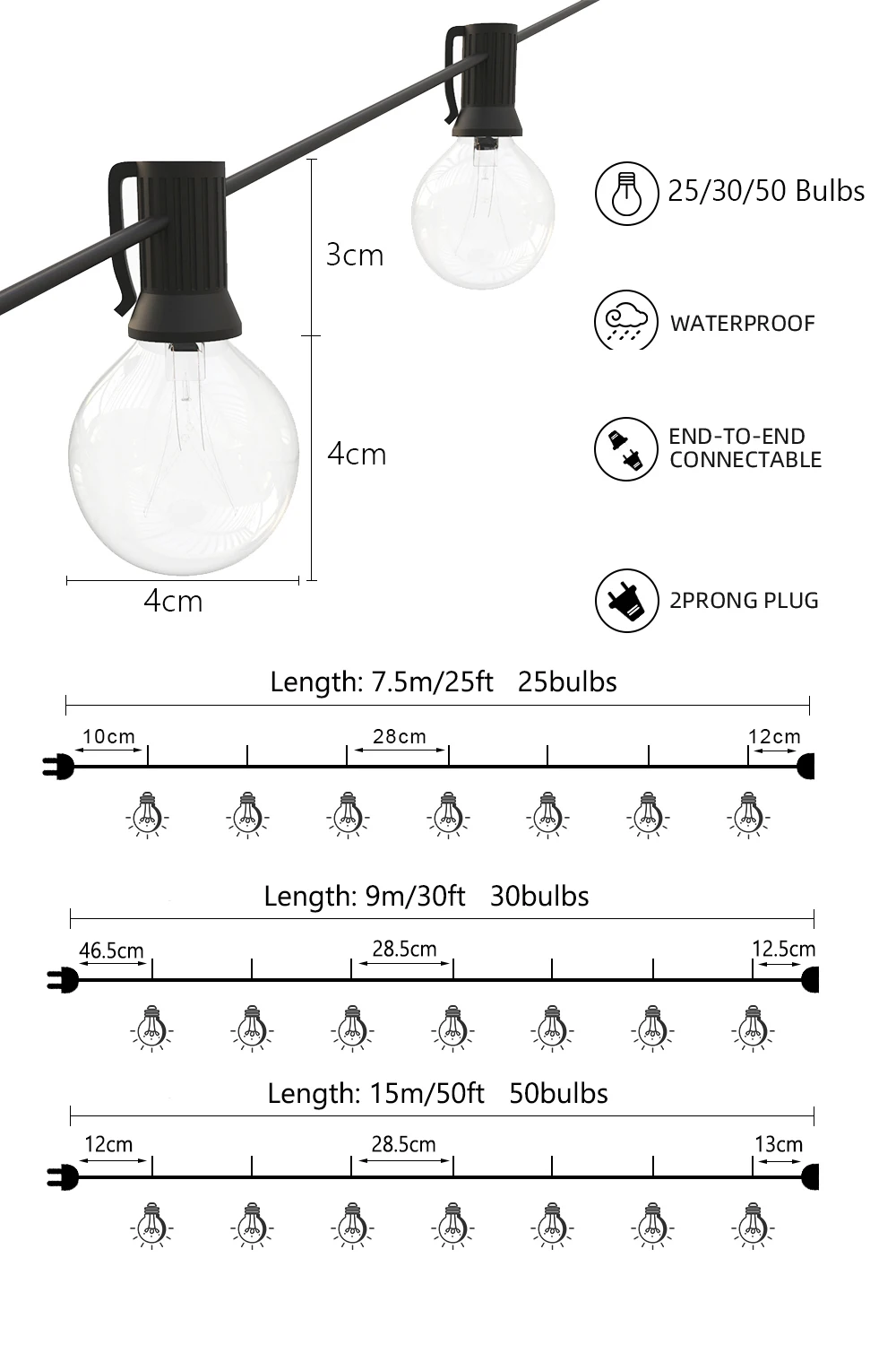 Гирлянда G40 с теплым белым светом, вечерние нисветильник ственский шнурок с круглыми лампочками, водонепроницаемый уличный шнурок для патио, сада, заднего двора