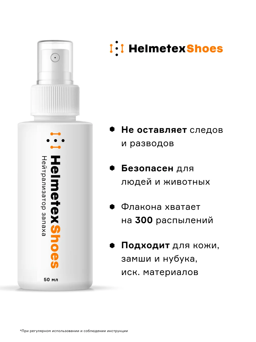 Нейтрализатор запаха на молекулярном уровне Helmetex Shoes не имеет аналогов в мире. Решает проблему неприятных запахов в обуви быстро и без дополнительной обработки и эффективно устраняет запахи пота, урины, крови, рвоты, табака, сырости и плесени. Спрей очищает от бактерий и продлевает срок службы ортопедической обуви и поддержание ее в чистоте.