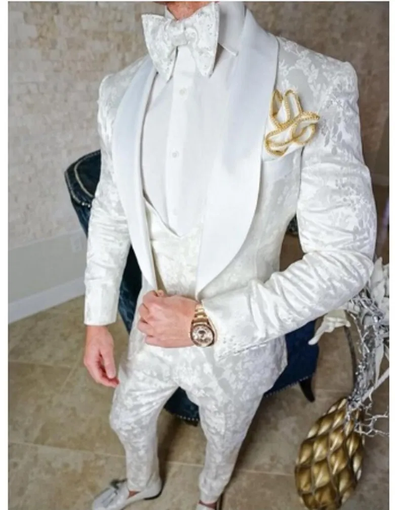 Новый дизайн, белые смокинги для жениха на одной пуговице, шаль с лацканами, мужские свадебные костюмы для выпускного вечера (куртка, брюки, жилет, галстук) : 501