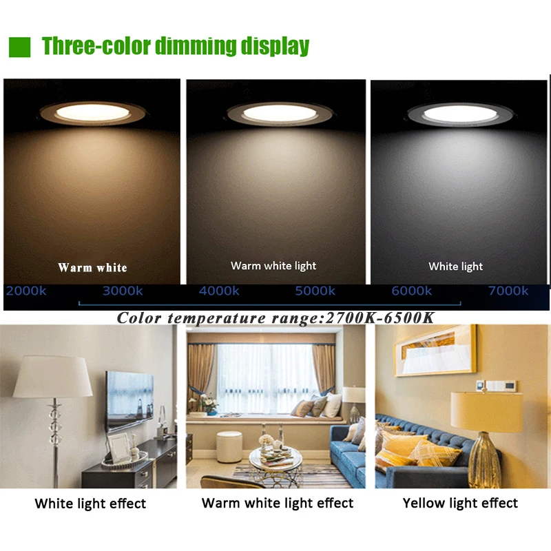Размер: 2,5 дюйма φ 92*55 мм (отверстие φ 70 мм) Мощность: 5 Вт Входное напряжение: AC85-265V Световая эффективность: 90 лм/Вт Максимальный световой поток: 400-460 лм CRI: >80 Цветовая температура: 2700-6500K + RGB " Размер: 3,5 дюйма φ 115*60 мм (отверстие φ 90 мм) Мощность: 7 Вт Входное напряжение: AC85-265V Световая эффективность: 90 лм/Вт Максимальный световой поток: 600-650 лм CRI: >80 Цветовая температура: 2700-6500K + RGB" Размер: 4 дюйма φ 140*65 мм (отверстие φ 110 мм) Мощность: 10 Вт Входное напряжение: AC85-265V Световая эффективность: 90 лм/Вт Максимальный световой поток:-950 лм CRI: >80 Цветовая температура: 2700-6500K + RGB "
