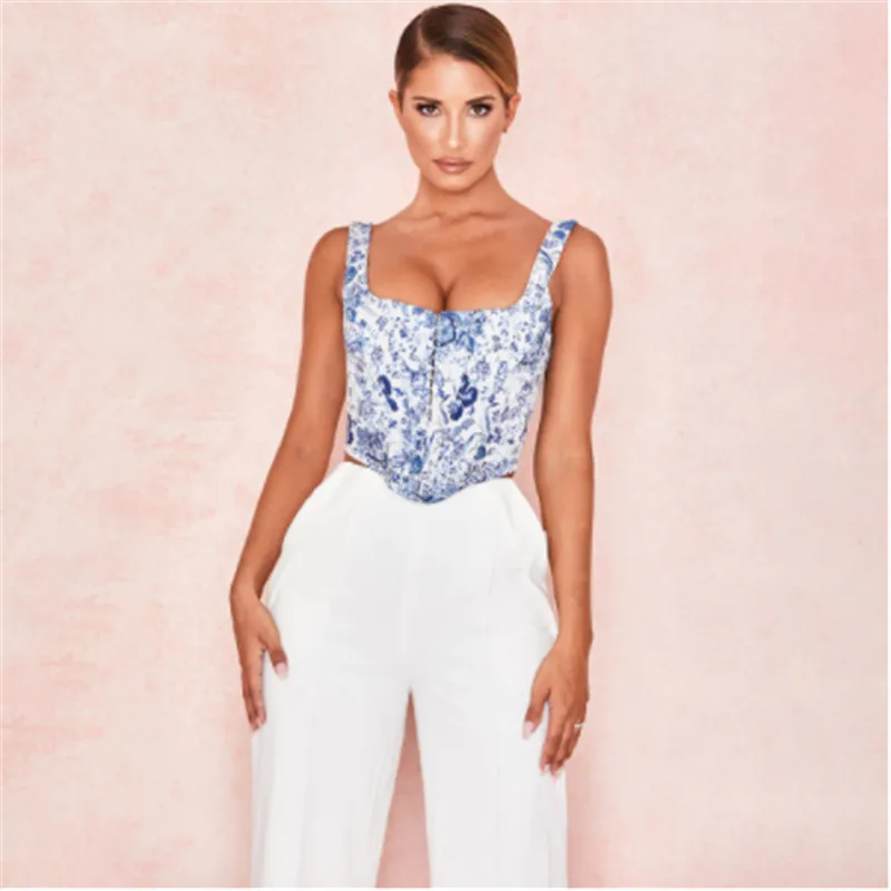 Женский корсет, топы, Летний жилет с фарфоровым узором, облегающая короткая майка без рукавов, одежда со скрытым рядом пуговиц на молнии, новинка 2021
