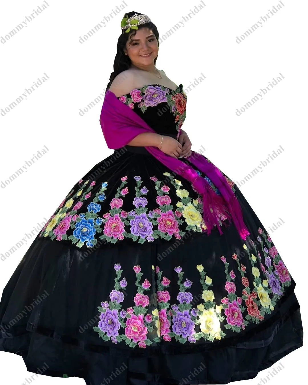 Сексуальное черное бархатное бальное платье Quinceanera для выпускного вечера женское 2022 красочные цветочные цветы с открытыми плечами