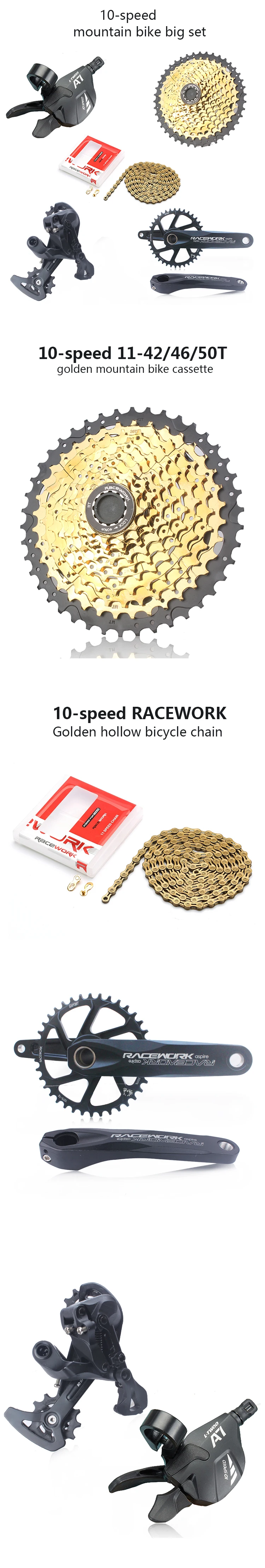 Задний переключатель передач 1x10s (Элитная версия, встроенная поддержка кассеты 50T)Усовершенствованная технология демпфирования для эффективного уменьшения дрожания цепиМегазвездочки: 50TShadow RD с наклонным дизайномБольшой подшипниковый шкив295 гРычаг переключения передач 1x10sТехнология 1:1 обеспечивает точный и быстрый ответАлюминиевый Рычаг переключения передачКабель переключения передач с технологией hyper с низким коэффициентом трения120 гRACEWORK 10 скоростей широкополосные кассетные винтыМатериал винта: никелированный, материал носителя: высокопрочная сталь, Золотой кассетЛегко устанавливается без модификации заднего отпаривателя11-42T: 11-13-15-18-21-24-28-32-36-42T Вес: 520 г11-46T: 11-13-15-18-21-24-28-34-40-46T Вес: 575 г11-50T: 11-13-15-18-21-24-30-36-42-50T Вес: 600 гСовместимость: система Скоростей Shimano HG 10RACEWORK 170 мм GXP шатуныНазвание продукта: кривошипный рычаг GXPМатериал: алюминиевый сплавЦвет: черныйBCD: GXPДлина дужки: 170Подходит для: SRAM XX1 XO1 X1 GX XO X9 и т. д.Вес: около 700 г (кривошипный рычаг)Название продукта: Звездочка GXPМатериал: 7075 T6 CNC алюминиевый сплавВес: 77 гЦвет: черныйХарактеристики: 32T/34T/36T/38T офсет 3 ммRACEWORK 10 скоростей SL Золотая полая цепьДлина: 116 звеньевВес: около 247 гИспользование: 10 скоростейЦвет: ЗолотойСовместимость: скоростная Система SHIMANO SRAM Campagnolo 10/11Волшебная Пряжка: входит в розничную коробкуУпаковка: оригинальный бокс