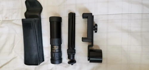 21 день, чтобы прибыть в Испанию. Он имеет хороший диапазон и также зум. Его диапазон несколько больше, чем примерно 10 х50. Чехол для телефона и штатив делают свою работу, хотя он сильно наклоняется и нестабилен из-за веса телефона. Хорошая покупка по цене