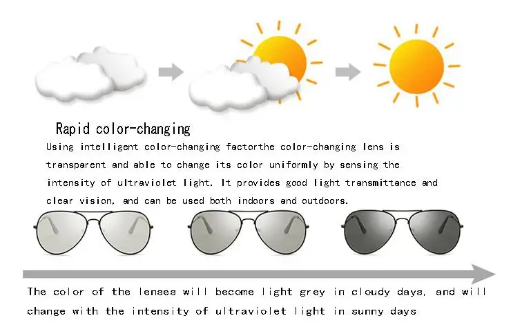Привет, я очень рад ответить на этот вопрос для вас. Прежде всего, солнечные очки используются для защиты глаз от ультрафиолетовых лучей солнца. Фотохромные функции которой очки практически не нужно поработать под ультрафиолетового окружающей среды, и Фотохромные функция на линзу обычных бытовых светильник ing (без ультрафиолетовый светильник) не будет выполнено или изменения не являются очевидными (это недоразумение некоторых клиентов). Если вам нужен тест, Используйте УФ-лампу. Я надеюсь, что вы можете понять, если у вас есть какие-либо вопросы, пожалуйста, свяжитесь с нами.