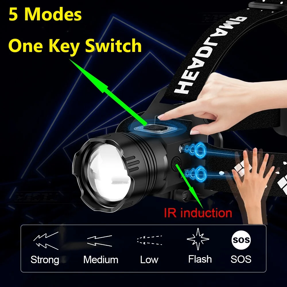 Новый XHP160 самый мощный светодиодный налобный фонарь 18650 ИК-датчик налобный фонарь перезаряжаемый налобный фонарик Usb рыболовная лампа светодиодный фонарь на голову
