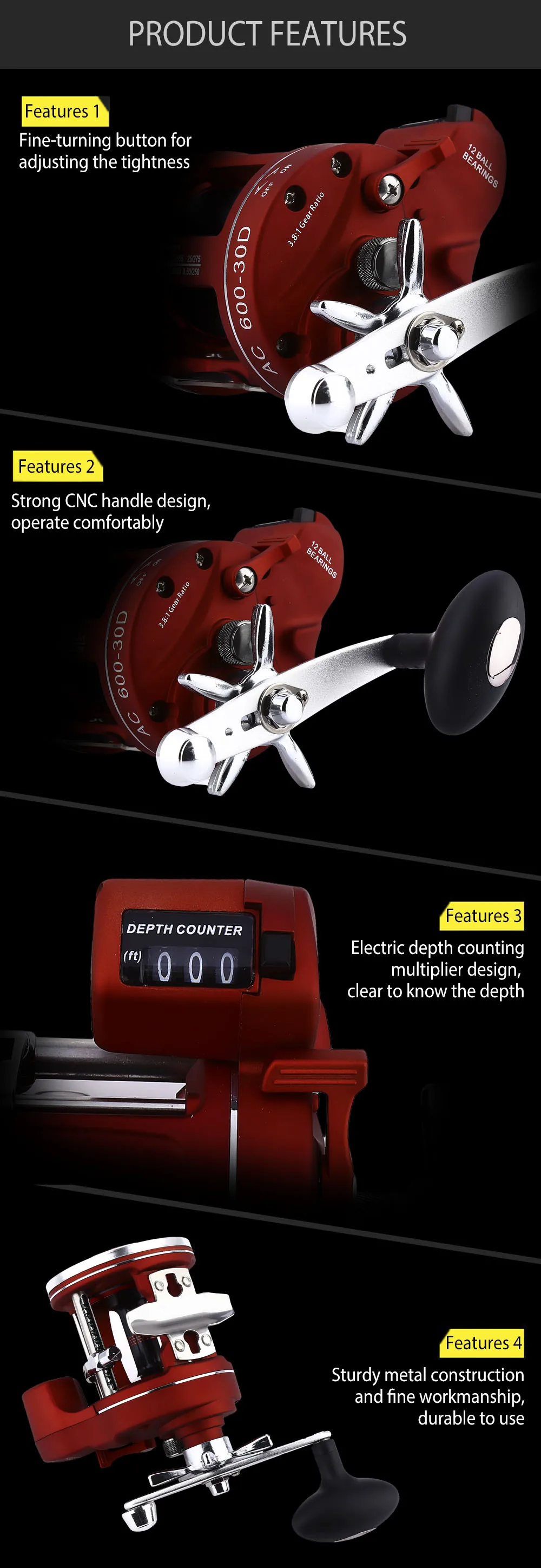 Эта катушка с 12 литыми барабанами с электрическим множителем для подсчета глубины подарит вам уникальный и удобный опыт рыбалки.