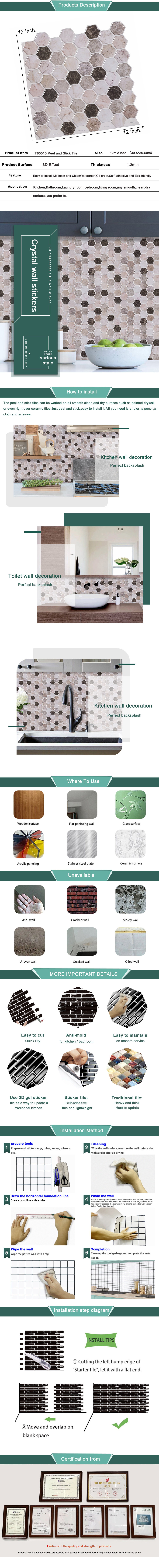 1: что такое кожура и палочка плитка? Кожура и палка плитка является простым способом DIY, чтобы освежить вашу кухню и ванной backsplash, и внутренней среды.2: Где можно установить пилку и плитку? Плитка может быть легко установлена непосредственно над существующими панелями или гладкой поверхностью. Специально разработанная для кухни и ванной, плитка устойчива к нагреванию плиток и влажности ванных комнат.3: сколько времени занимает этот продукт? Материал этого продукта-ПЭТ + PU клей, большое количество и экологически чистый материал. Регулярное использование жизни составляет 5-10 лет или больше, в зависимости от окружающей среды.4: Как удалить кожуру и наклеить плитку? Если вы хотите удалить плитку, вы можете использовать фен для прогрева клея и мягко вытянуть, начиная с углов.5: Как чистить и поддерживать плитку? Очень легко чистить кожуру и наклеить плитку, просто нужна влажная ткань. И, пожалуйста, не используйте химикаты или абразивы для очистки6: Могу ли я установить его на стену для душа? Для того, чтобы плитки могли использоваться в течение длительного времени, нежелательно устанавливать их там, где они будут непосредственно контактировать с водой. Однако, так как эти продукты устойчивы к влажности ванных комнат, Вы можете установить их на высоте, где они не будут находиться в прямом и непрерывном контакте с водой.7: Могу ли я установить его рядом с кухонными пластинами? Да, невозможно установить рядом со стеклянными керамическими кухонными пластинами, но обратите внимание, что плитка не должна напрямую контактировать с пламенем. Не устанавливайте плитку на расстоянии менее 16 дюймов от верхней части плиты с газом.8: Могу ли я установить на стену свежей краски? Не устанавливайте ее на свежую краску. Высушите и высушите краску до установки плитки в течение 4-6 недель.