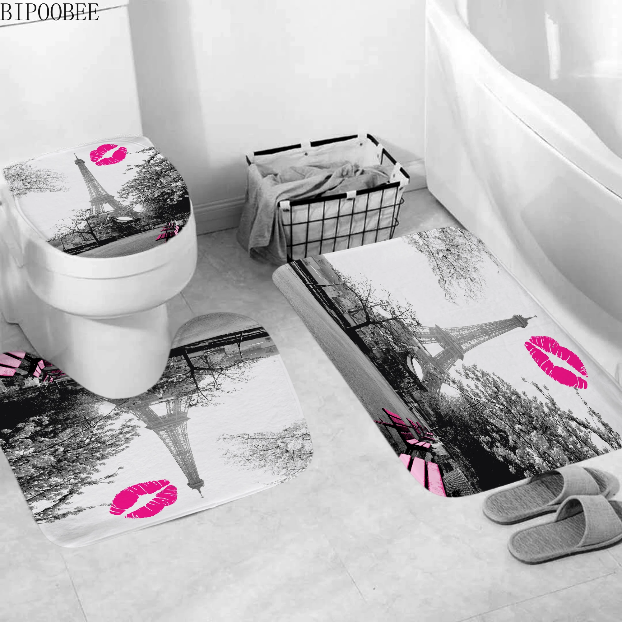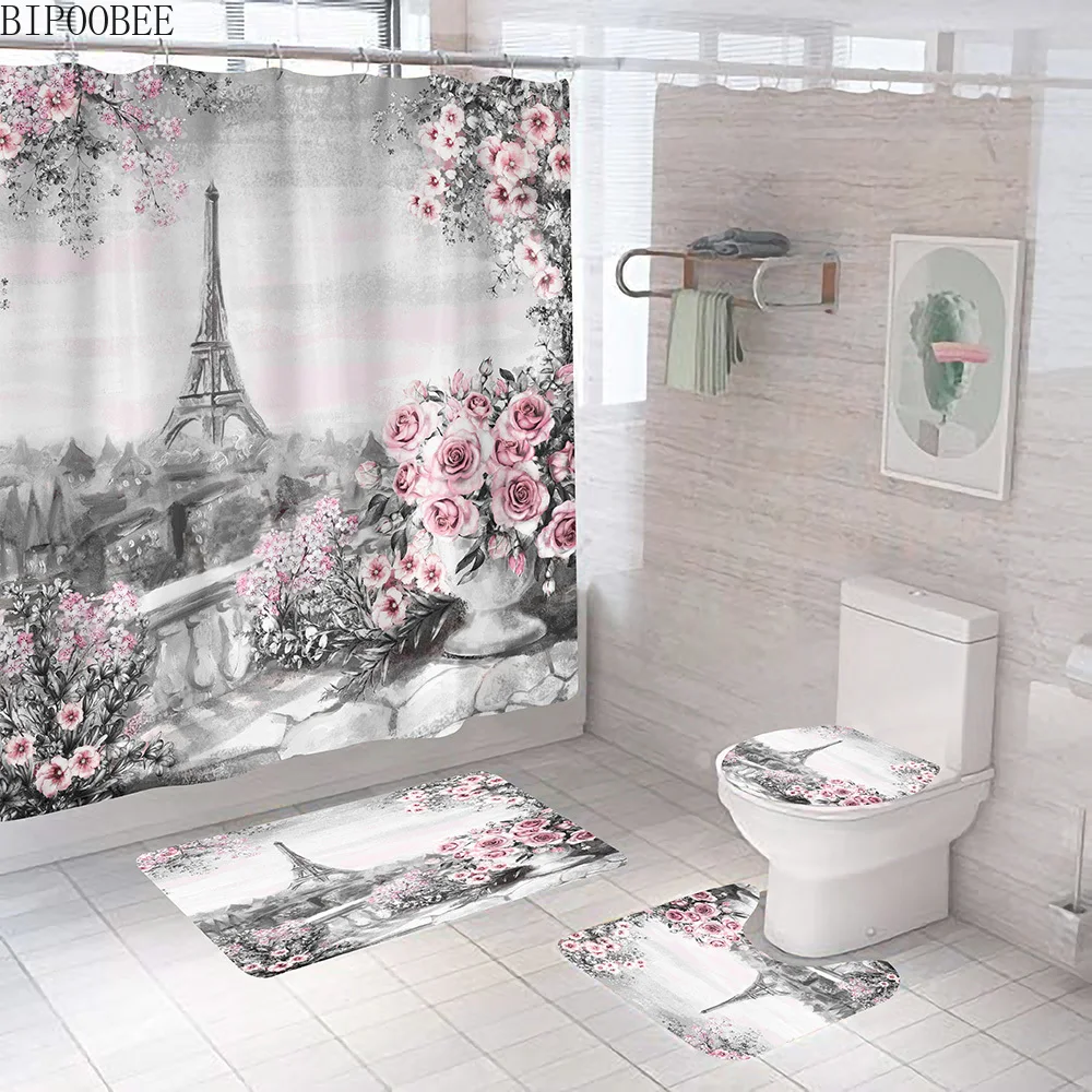 Занавеска для ванной комнаты, с 3D Эйфелевой башней, с изображением Парижского пейзажа, набор ковриков для ванной, с крючками, нескользящая, коврики для туалета