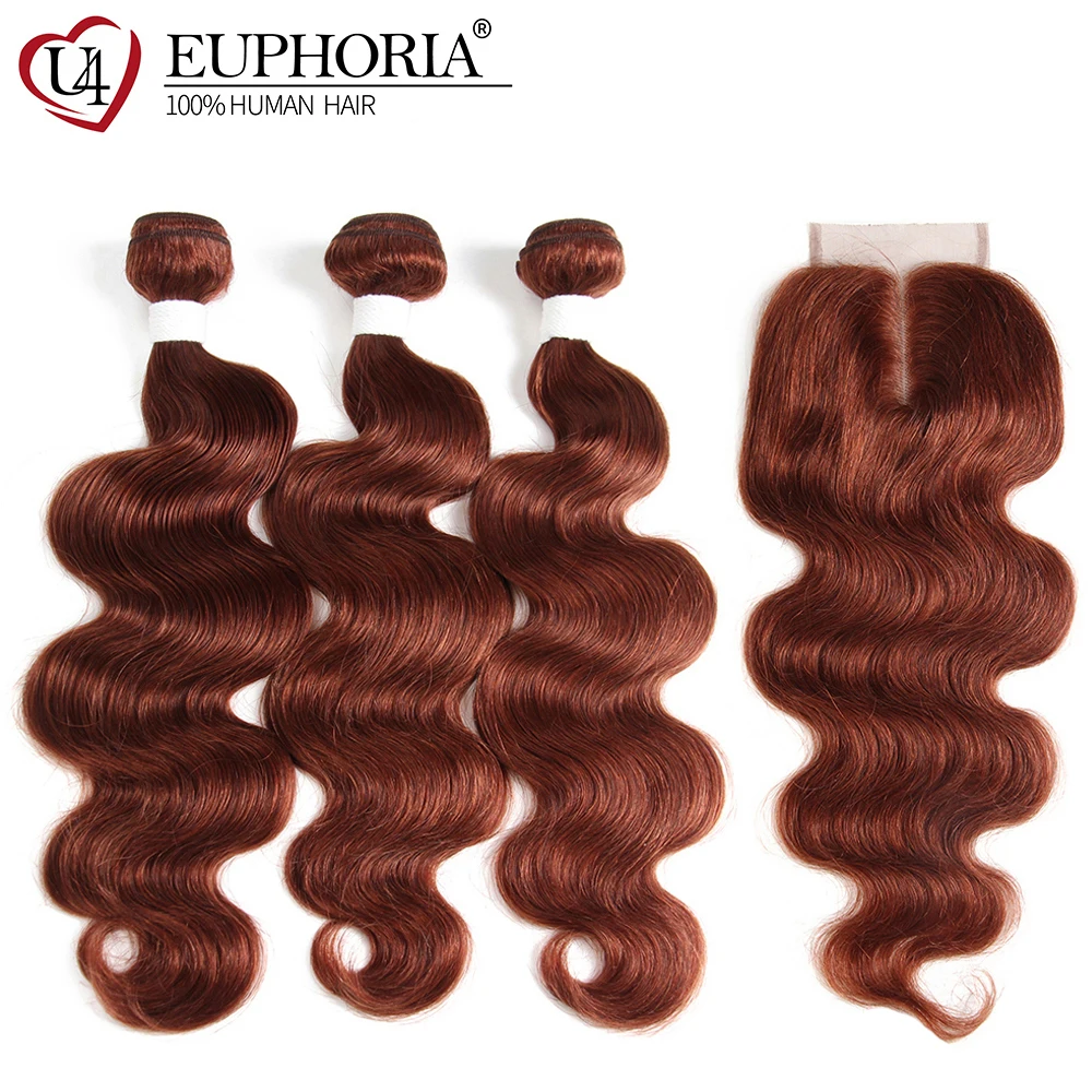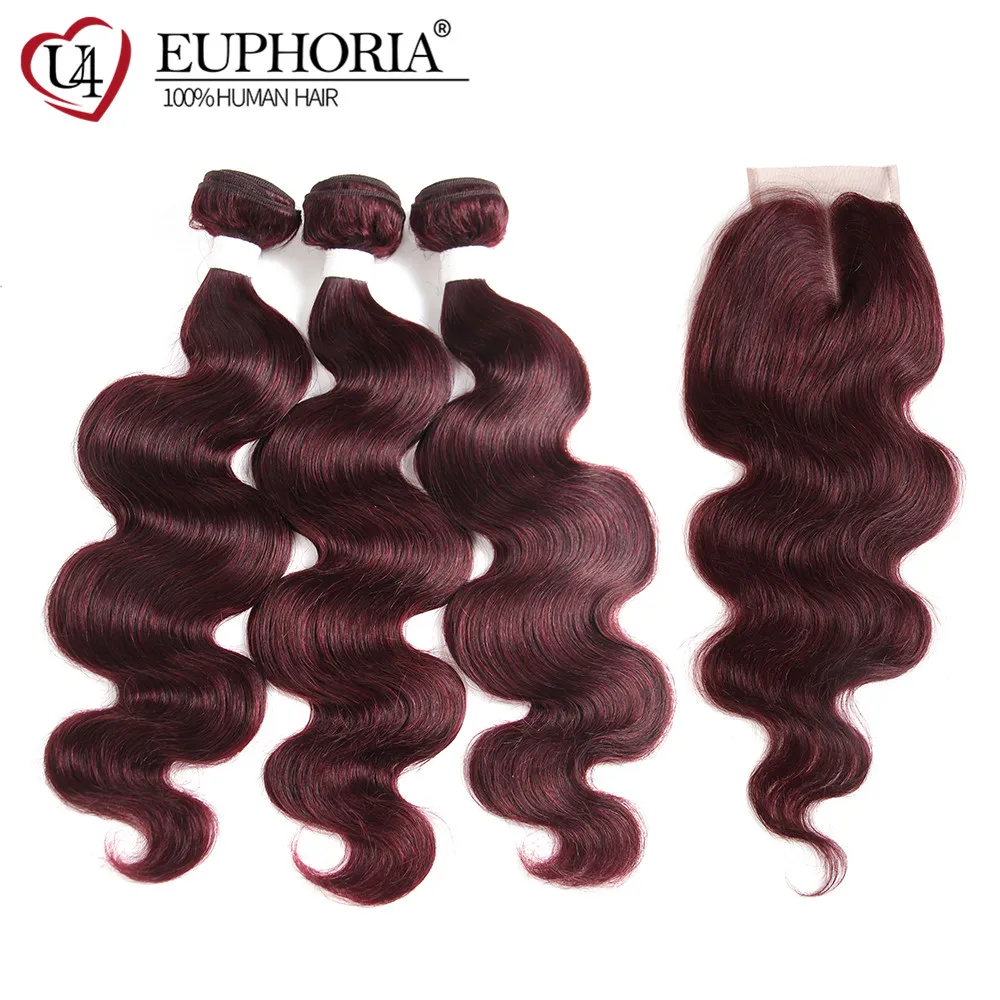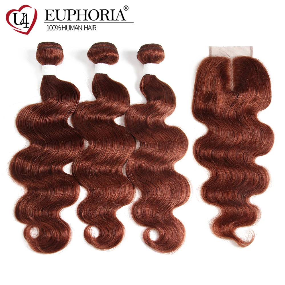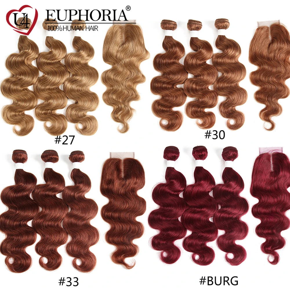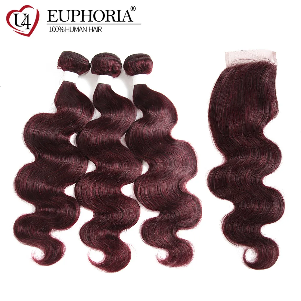 Коричневые 33 пупряди волос с закрытием, волнистые бразильские человеческие волосы Remy, 3 пряди с кружевной застежкой 4x4, Burg красного цвета, Эйфория