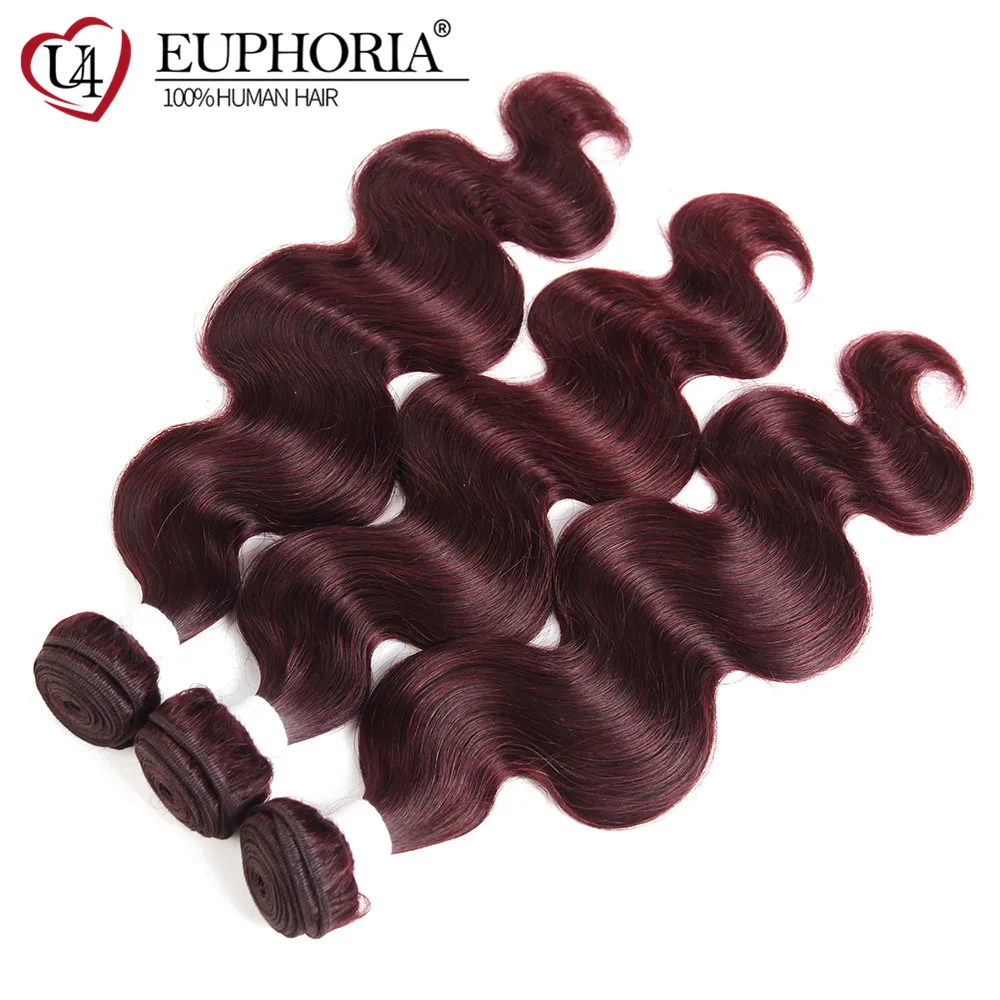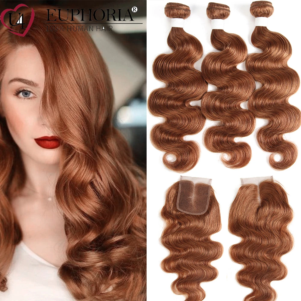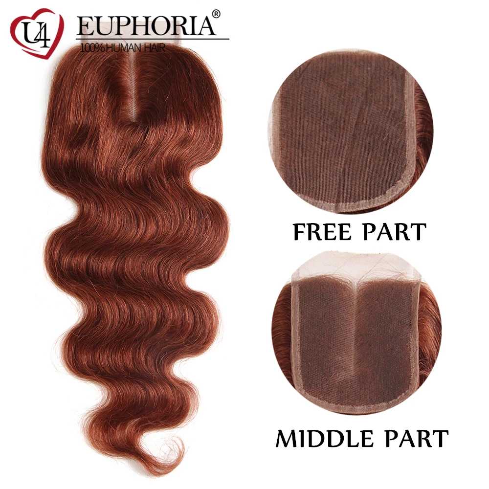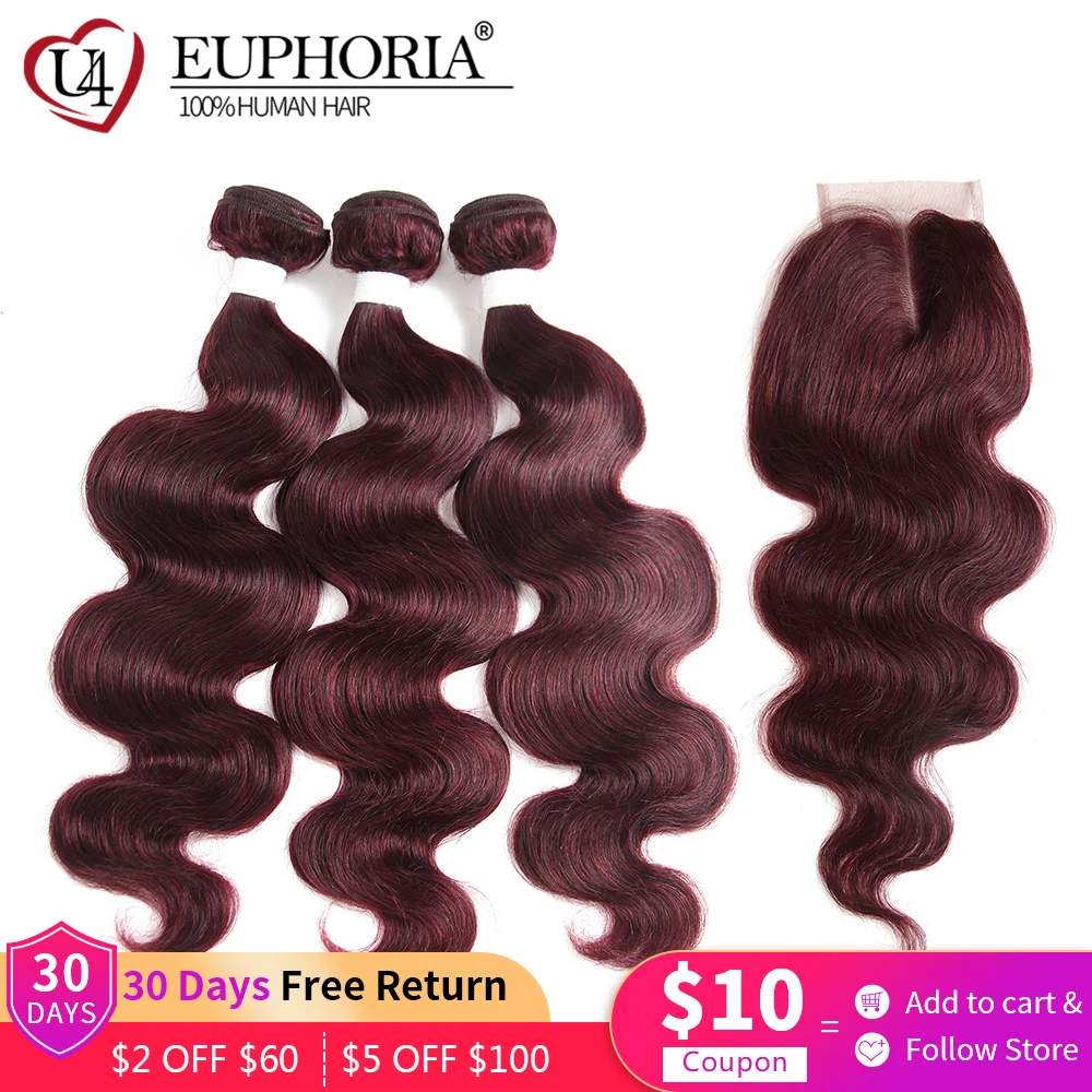 Коричневые 33 пупряди волос с закрытием, волнистые бразильские человеческие волосы Remy, 3 пряди с кружевной застежкой 4x4, Burg красного цвета, Эйфория