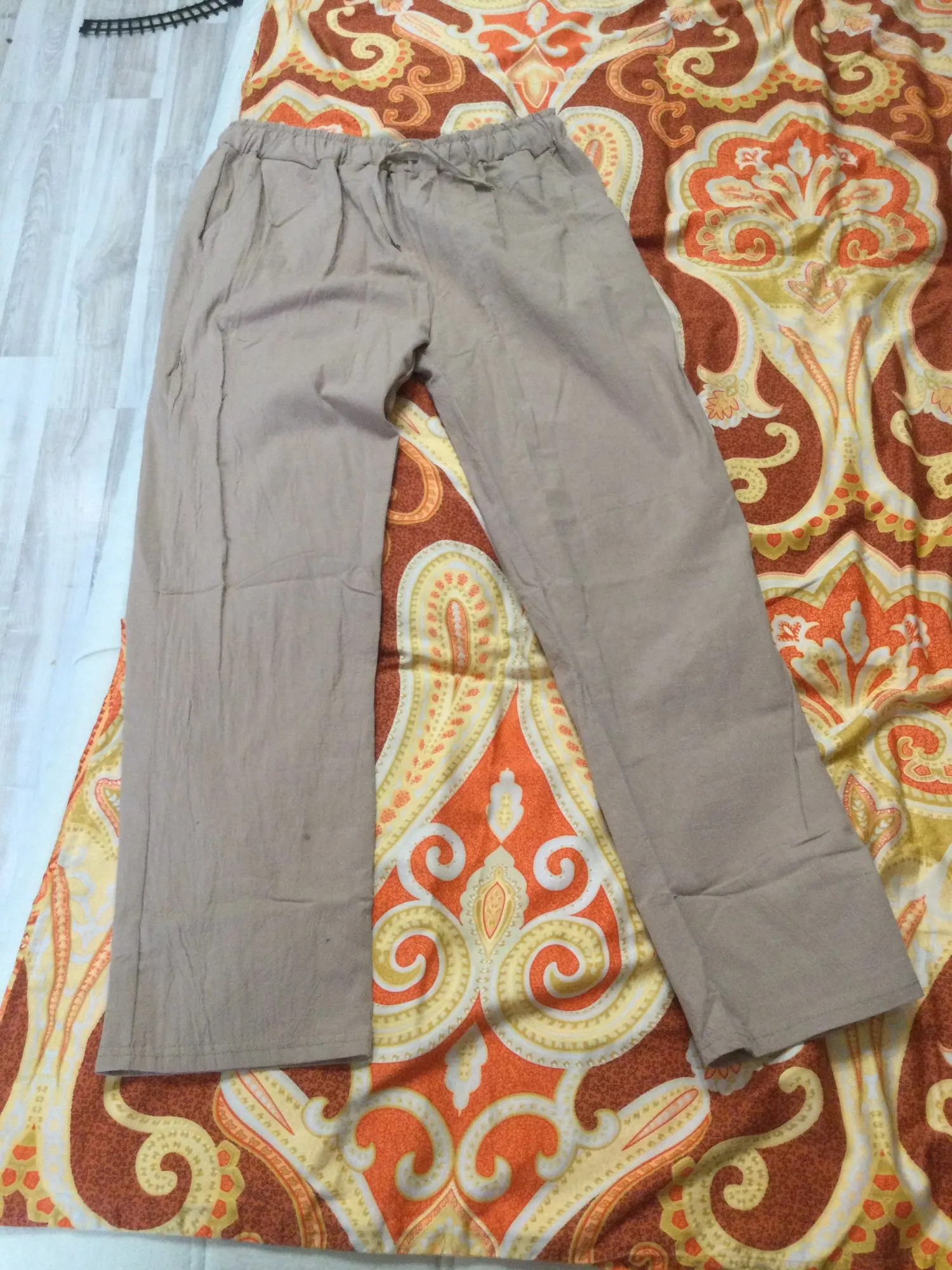 Полная ерунда, ткань не лён, а какая то подделка очень низкого качества, напоминают больничную пижаму, сидят так же . Совершенно фото не соответствуют. Маломерки.