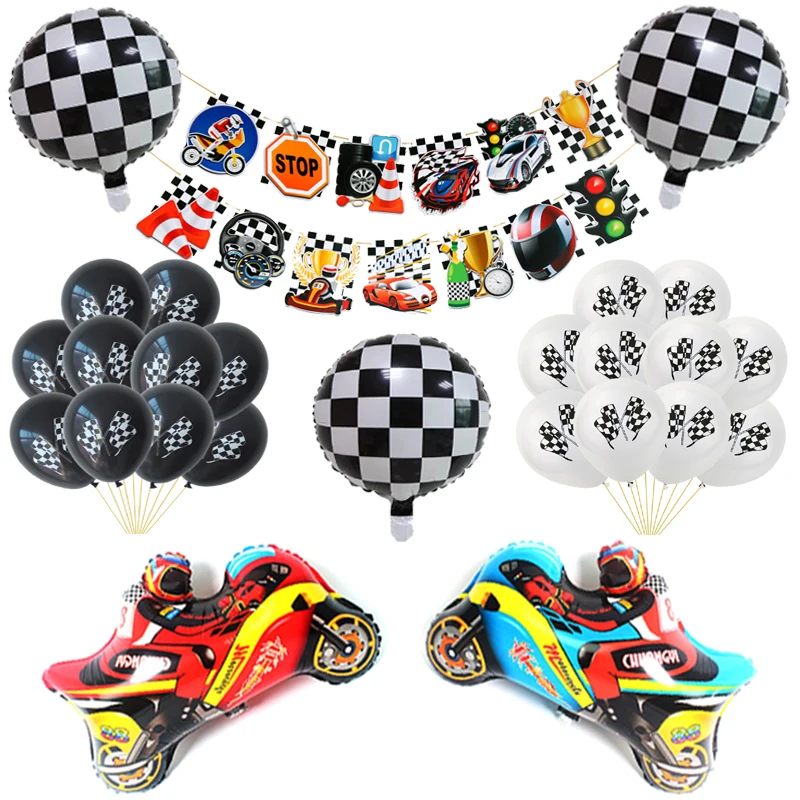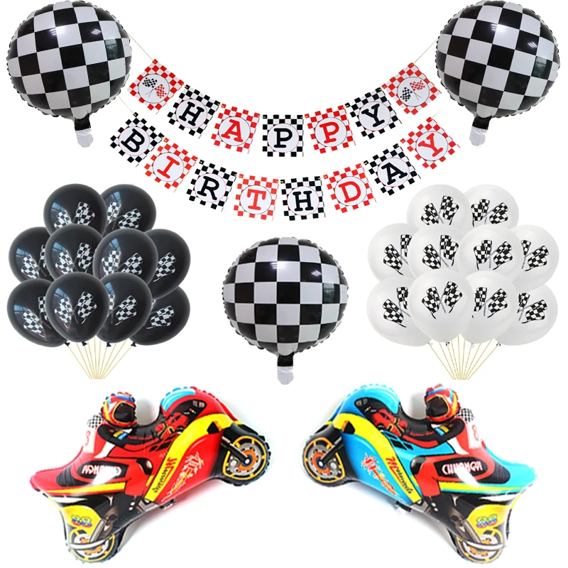 1 комплект черный, белый цвет клетчатый гонки автомобильные воздушные Шары Баннер синий и красный цвета МОТОГОНКИ День рождения Декор малыш мальчик автомобиль игрушки мотоцикл клипсы для воздушных шаров