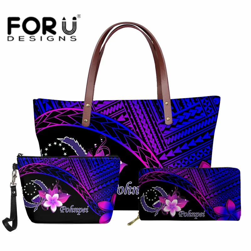Фиолетовая плечевая сумка Pohnpei Tribe Plumeria для женщин, роскошная сумка 3 шт.компл., тоут, полинезийская сумка и кошелек Kakau большой вместимости