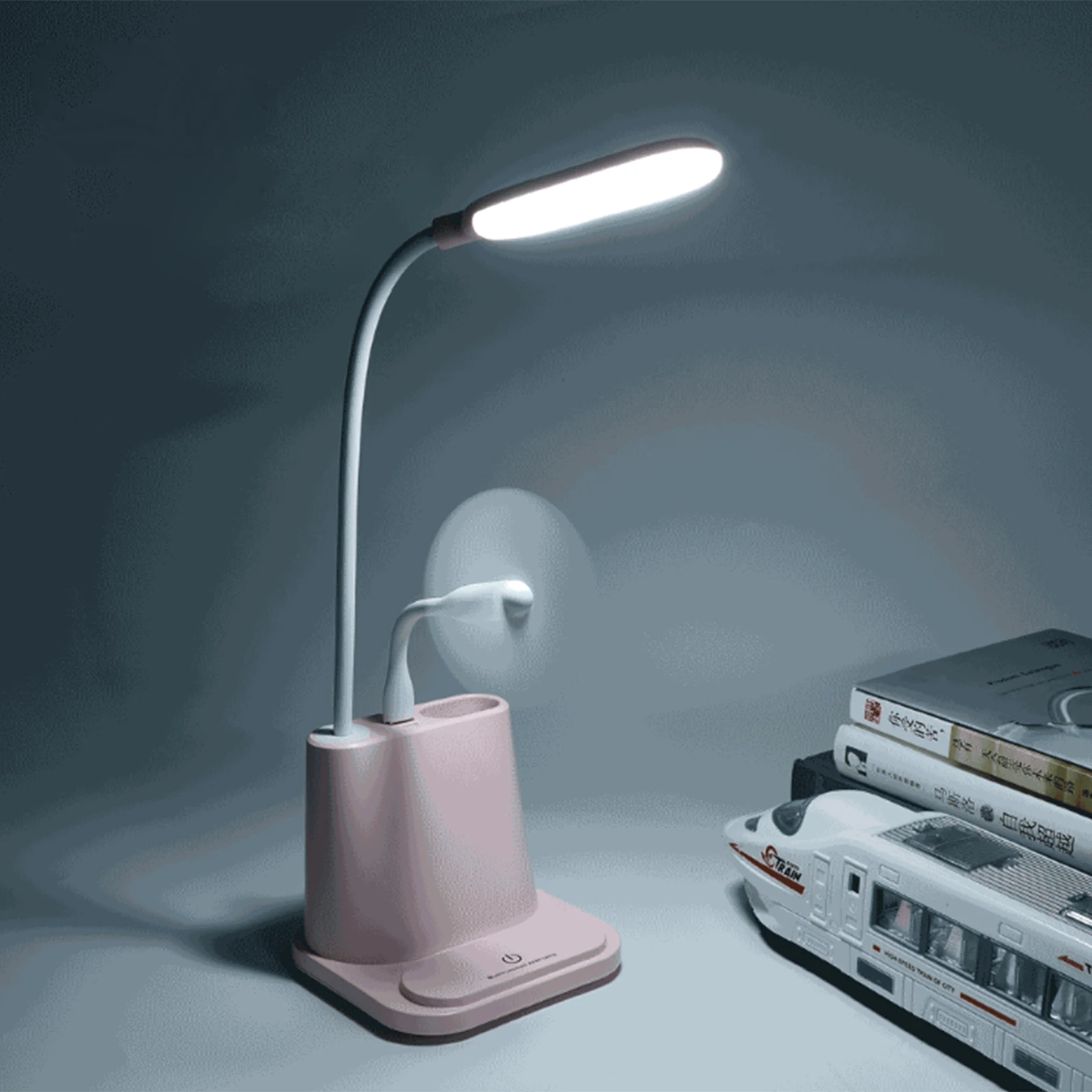 Светильник ПА для чтения, сенсорная светодиодный, 1200 мА ч, 11,2x12,3x43,6 см, регулируемая, розово-белая, 360 градусов, с USB вентилятором, настольные лампы
