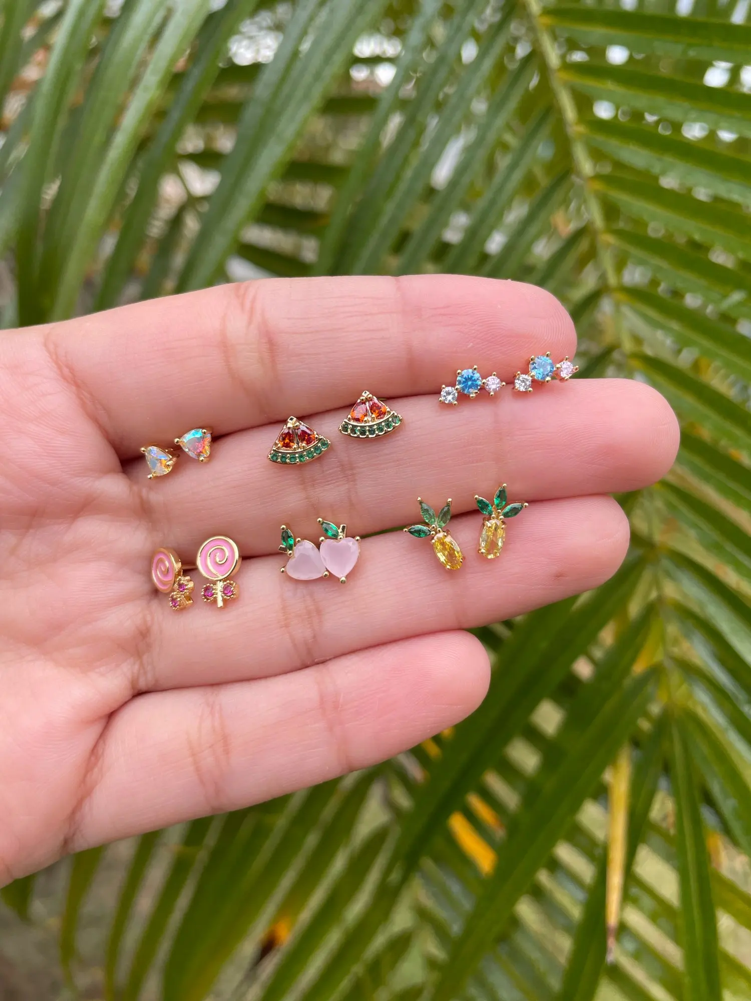 [Тип товара]: медные серьги-гвоздики с разноцветными фруктовыми кристаллами циркония