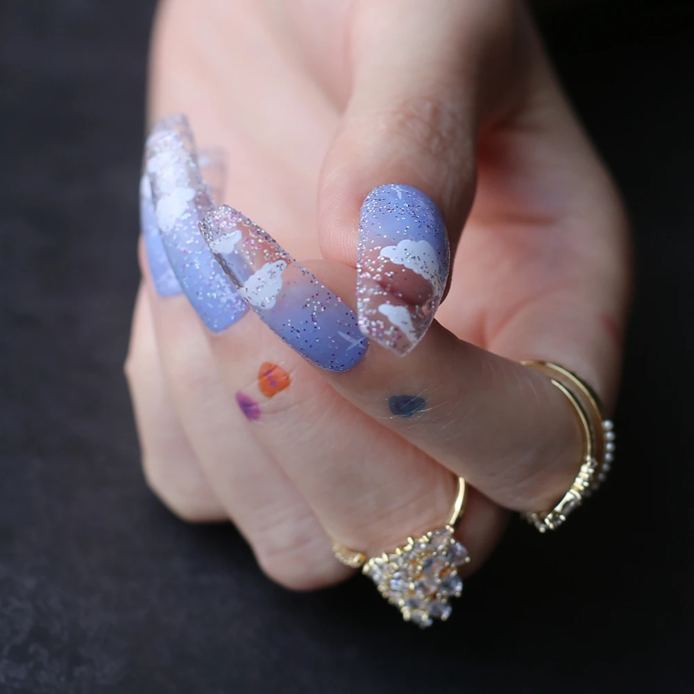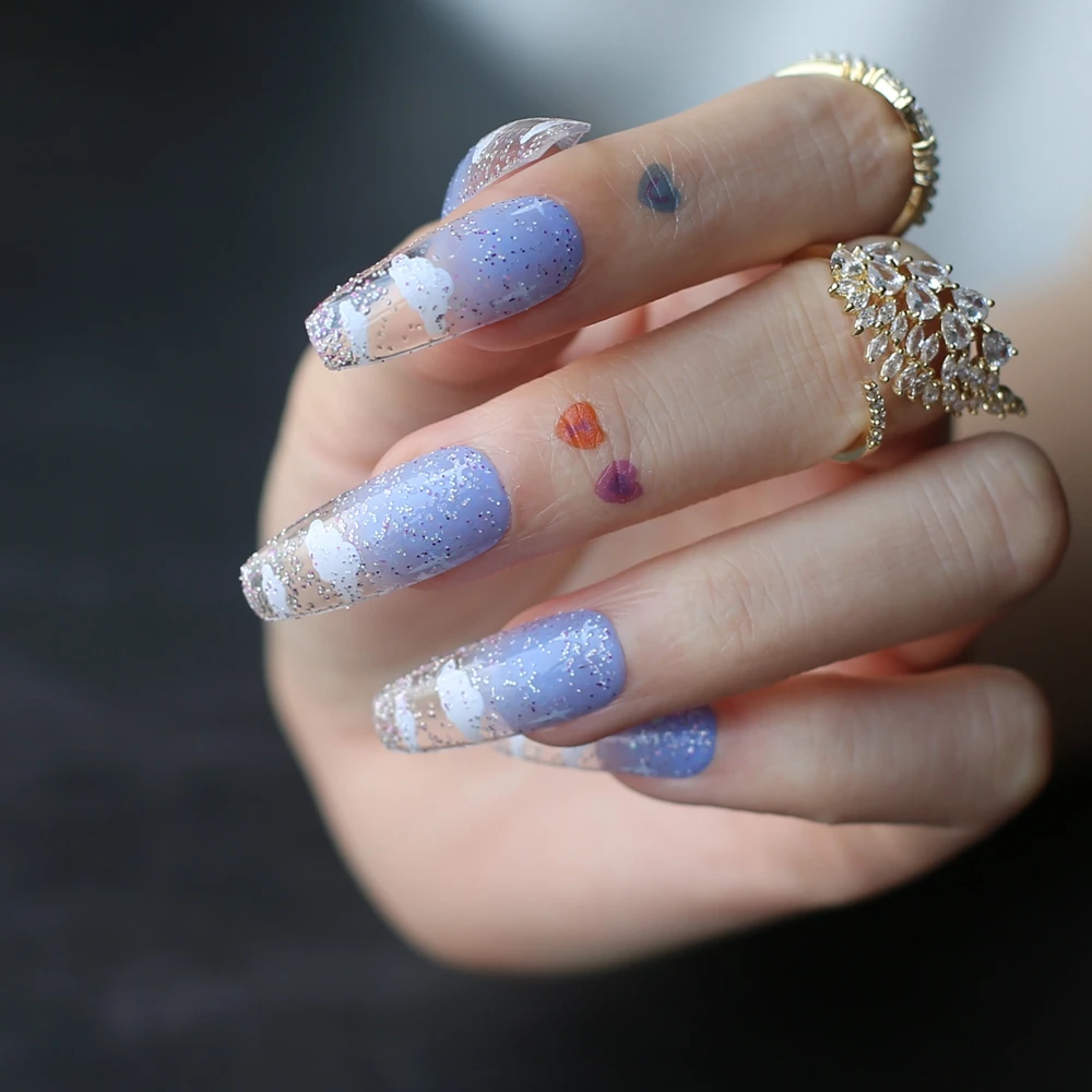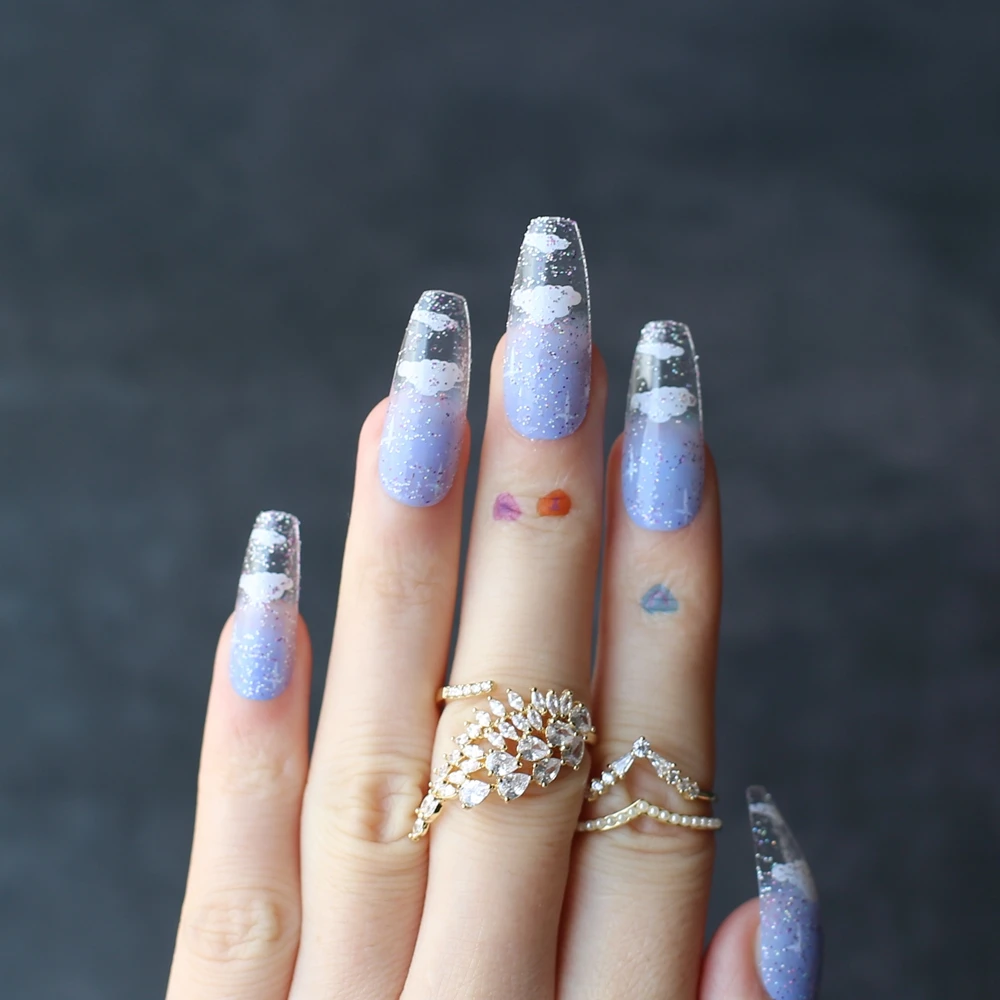Роскошный гроб синий прозрачный Омбре облака светящиеся желе облако отвесное голубое небо блестящие летние накладные ногти мечтательные звезды