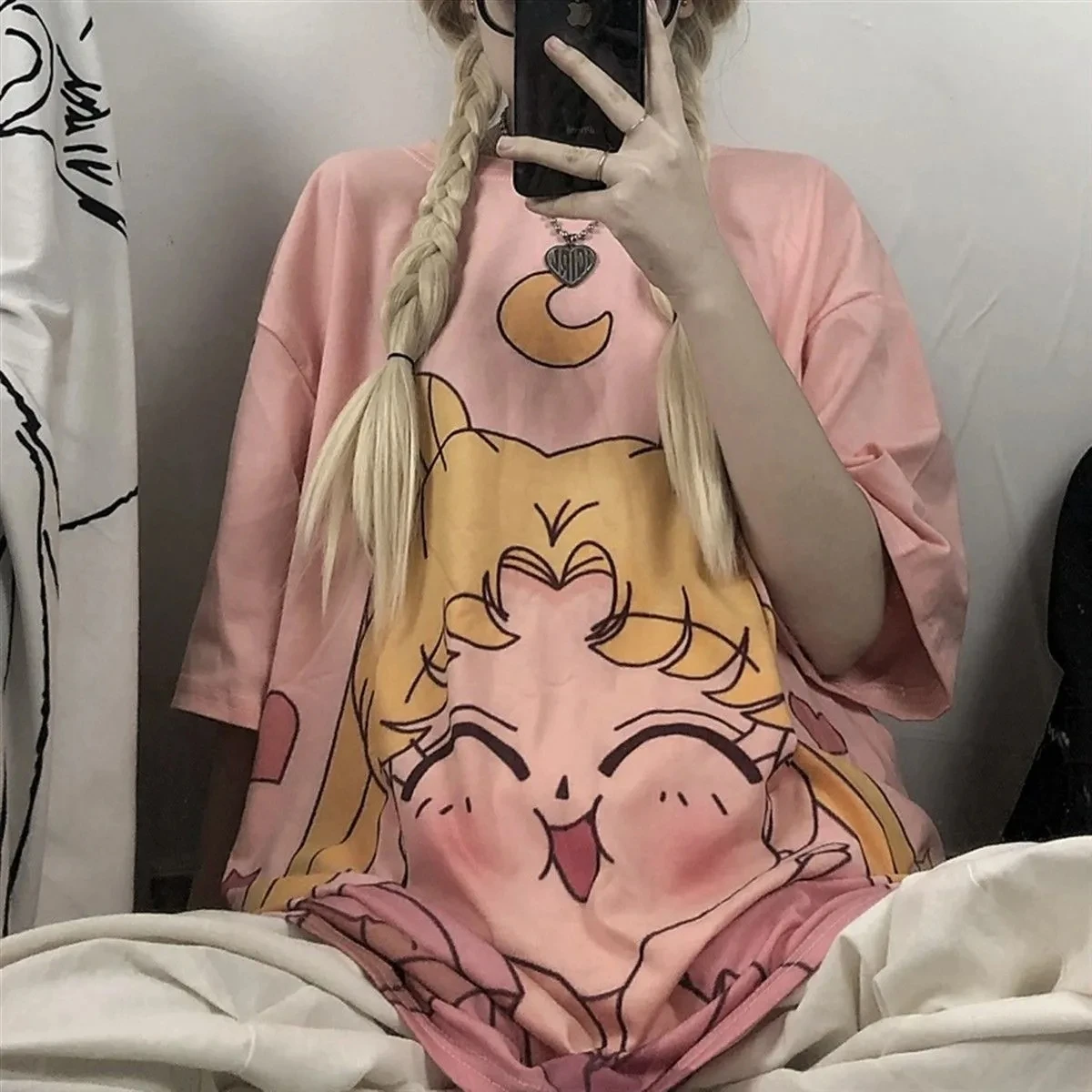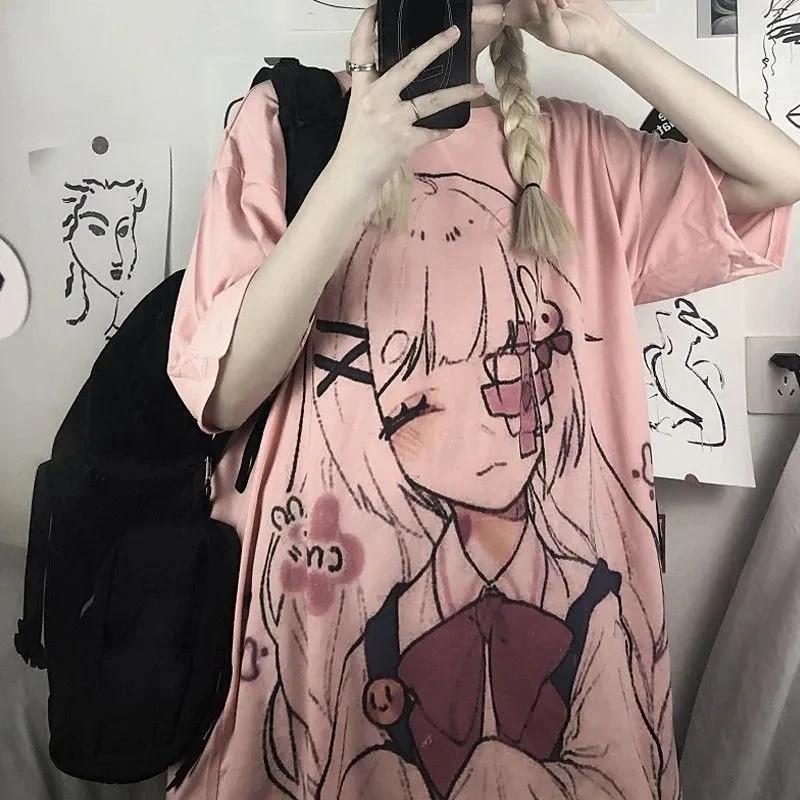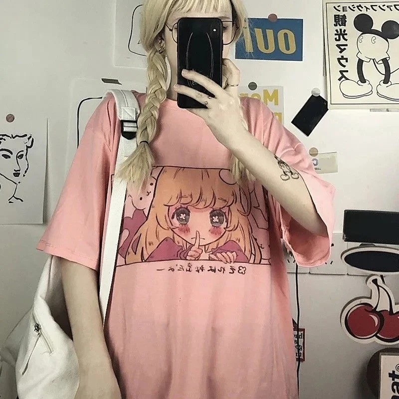 Летняя Милая футболка с мультяшным принтом для девочек, Японская уличная одежда в стиле Харадзюку, милые повседневные винтажные свободные футболки с круглым вырезом, женские топы