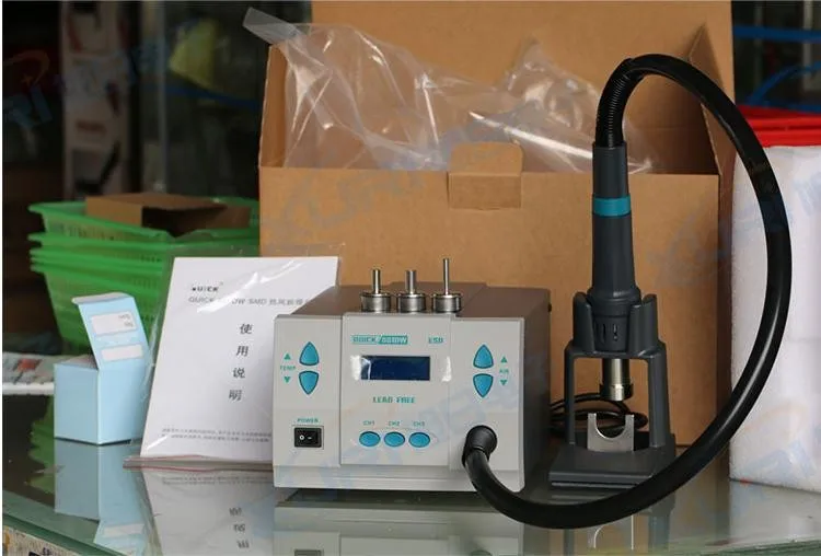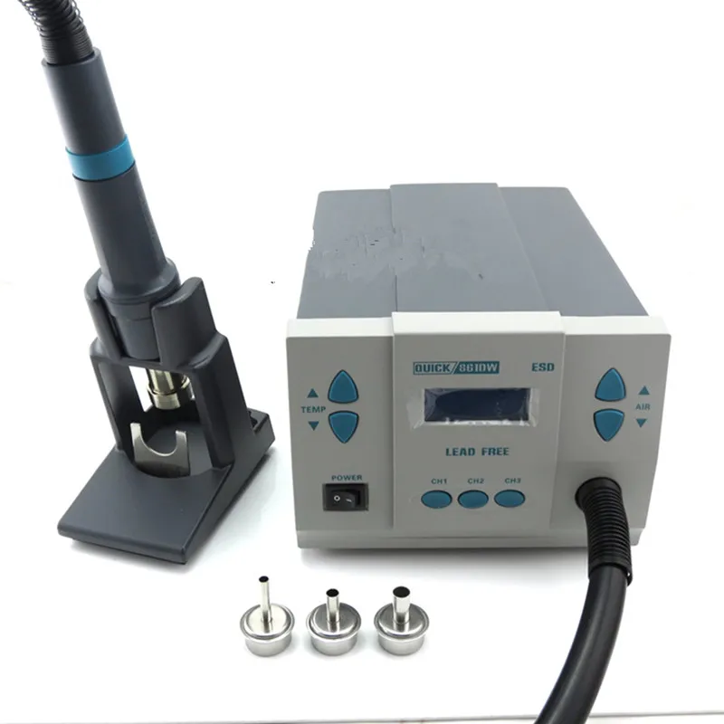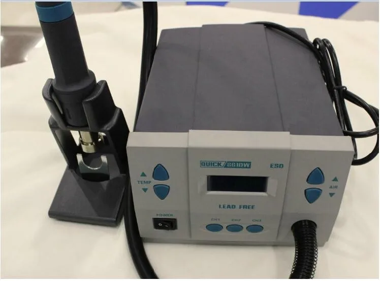 Бессвинцовая станция QUICK861DW Особенности * С тремя рабочими каналами CH1, CH2, CH3, и каждый канал может быть установлен объем воздуха, температура. * Защита паролем и функция блокировки ключей. * Простое управление в режиме реального времени, с магнитной ручкой управления переключателя помещается в ручные полки немедленно в спячку. * С автоматической функцией сна, в спящем состоянии могут быть установлены параметры. * Сенсорная замкнутая петля, микрокомпьютер с нулевым пусковым механизмом контроля температуры, питания, нагрева быстро, легко и точно регулировать температуру стабильно, без влияния ветра. * Бесщеточные вентиляторы Eddy, регулируемый поток воздуха, большой диапазон, могут быть адаптированы к различным видам использования. * Система с автоматической функцией охлаждения ветровой мощности, продлевает срок службы нагревательного элемента и защищает ручку горячего воздуха. Параметры