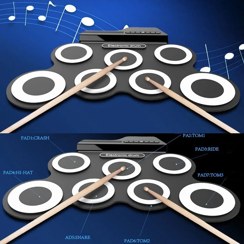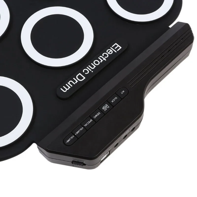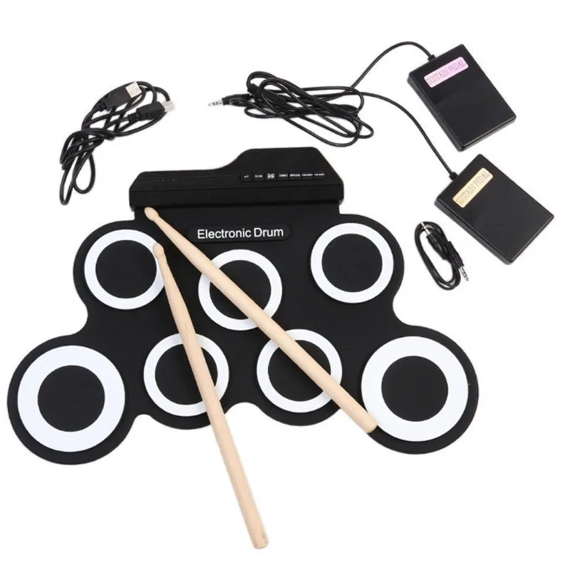 Компактный размер и портативный складной электронный барабан, очень удобно носить с собой и хранить. С 7 силиконовыми барабанными подушечками, включая Том/Малый/Hi-Hat/аварию/езду, издает отличные звуки и имитирует настоящий эффект биения. Позиции SNARE и HI-HAT можно заменить, нажав специальную кнопку, в соответствии с hahit игрока. Встроенные 5 тонов барабана, 8 Демо-песен и 3 типа ритмов для упрощения практики. Поддерживает порт USB или источник питания 2 * батарейки типа "ААА" (батареи в комплект не входят) С разъемом для наушников 3,5 мм для подключения внешних наушников или динамиков. С MP3 входом для подключения MP3/смартфона/планшета к воспроизведению сопровождающей музыки. Поставляется с парой барабанных палочек, 2 педалями сустейн, USB-кабелем и аудиокабелем 3,5 мм. Идеально подходит для обучения и практики детей или начинающих, семейных развлечений и собирания друзей.