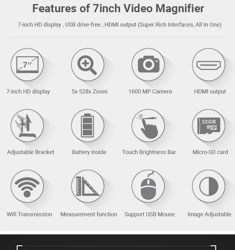 Экран Размер: 7,0 дюймовРазрешение экрана: 1024x600Датчик изображения: 1/3 дюйма (BSI);Размер пикселя: 2 мкм x 2 мкм;Разрешение изображения: 2688x1512,5376*3024 (интерполяция);Разрешение видео: 1080P/30 кадров в секунду (прозрачный) /720P/60 кадров в секунду (Гладкий);Разрешение HDMI: 720P60FPS;Разрешение USB: 1080P/20 кадров в секунду, 720P/30 кадров в секунду, WVGAP60;Выход WIFI: 720x36 0/30 кадров в секунду, Поддержка Android и iOS;Увеличение: 5X ~ 528X (оптический 5X ~ 33X, цифровой 1X ~ 16X)Формат видео: MOVФормат изображения: JPGДлина видео: 3 минутыКонтроль экспозиции: замок AE, компенсация экспозиции (10 уровней регулируется);Баланс hite: автоматический, ручной (R,G,B 10 уровень регулируется), калибровка;Управление изображениями: десять уровней регулировки контрастности, насыщенности и резкости;Сравнение PIP: полный экран, левый и правый, вверх и вниз, 1/4;Сетка: 8 групп, положение, цвет, толщина регулируется;ИК-пульт: максимум 5 метров;Расстояние Wi-Fi: максимум 10 метров;Интерфейс HDMI: C TYPE / MINI HDMI;Интерфейс USB: TYPE-B USB2.0;Слот для tf-карты: максимальная поддержка 64G tf-карты;Поддержка языков: китайский, английский, русский, японский, немецкий, французский, испанский, португальский