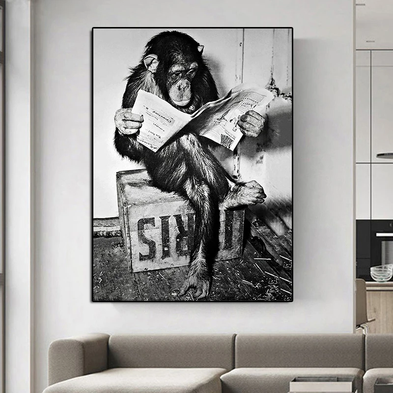 Черно-белая Картина на холсте с изображением обезьяны для чтения