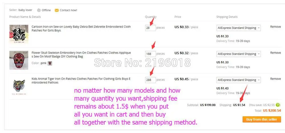 Если вас интересует оптовая покупка или большом заказе, пожалуйста, вы можете положить все патчи, которые вам нужны в корзину, затем отправьте смешанный заказ и купить все вместе, общая стоимость доставки остается около 1,5 $ несмотря на то, что ваше обще количество является 1000 шт., очень дешево, как показано ниже. Если ваш заказ превышает 100 $, мы отправим его DHL,UPS,Fedex,DPEX или другим способом быстрой доставки для большинства стран при условии, что в вашем магазине нет следов от мультфильмов Заказ. Если вы не уверены, что такое Мультяшные нашивки или нет, пожалуйста, не стесняйтесь направлять нам сообщения на aliexpress.