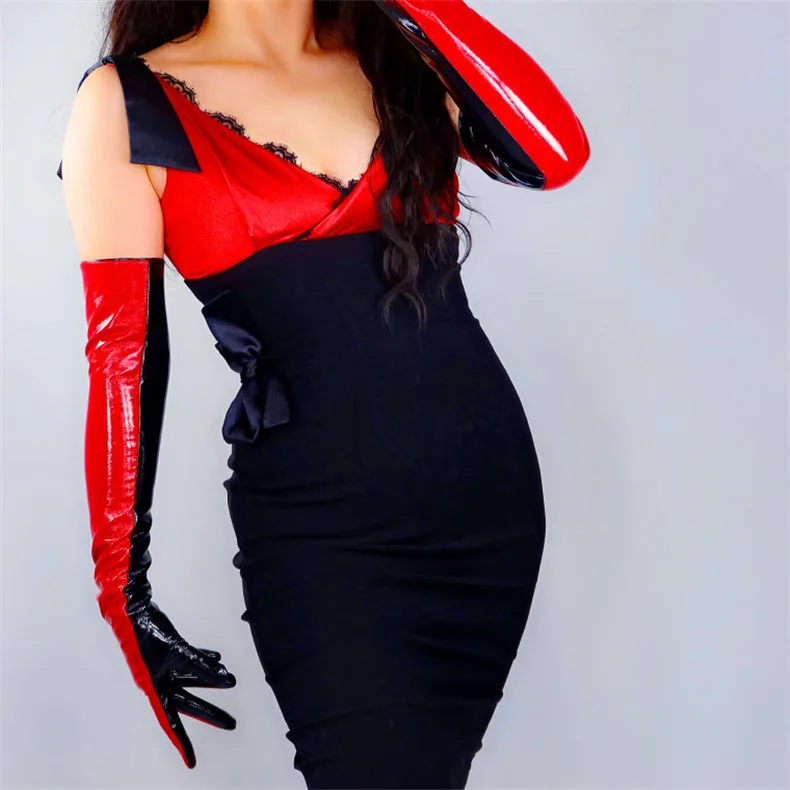 Длинные женские перчатки из лакированной кожи, 60 см, из искусственной кожи, с имитацией овечьей кожи, яркие черные, белые, двухцветные женские перчатки WPU317
