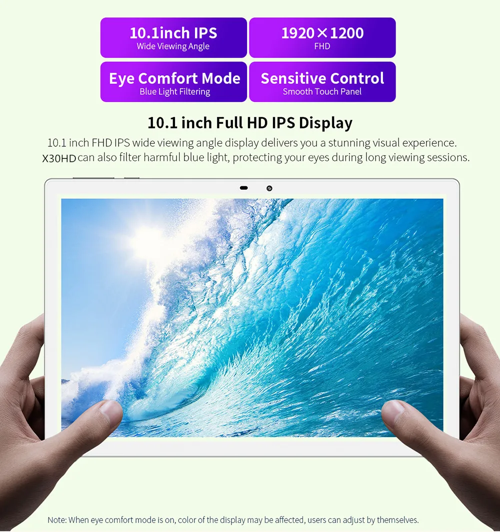 10,1 дюймов FHD IPS широкий обзор отображение угла обеспечивает вам ошеломляющий визуальный вид. X30HD также может фильтровать вредный синий светильник, защищая глаза во время длительных сеансов просмотра.
