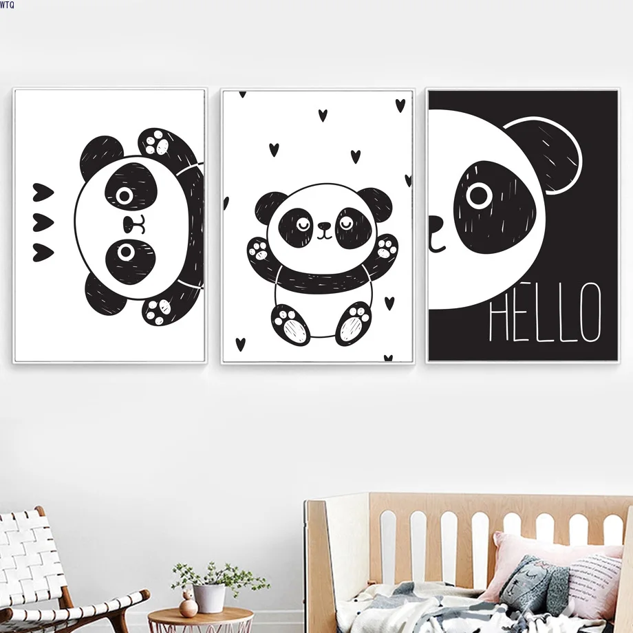 Кавайная панда, настенная Картина на холсте, черно-белая картина с цитатами Hello, плакаты и принты, картина в скандинавском стиле, декор для детской комнаты, спальни