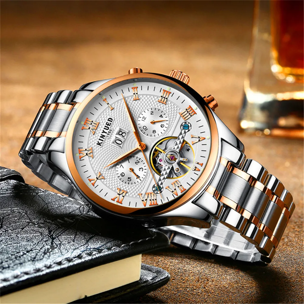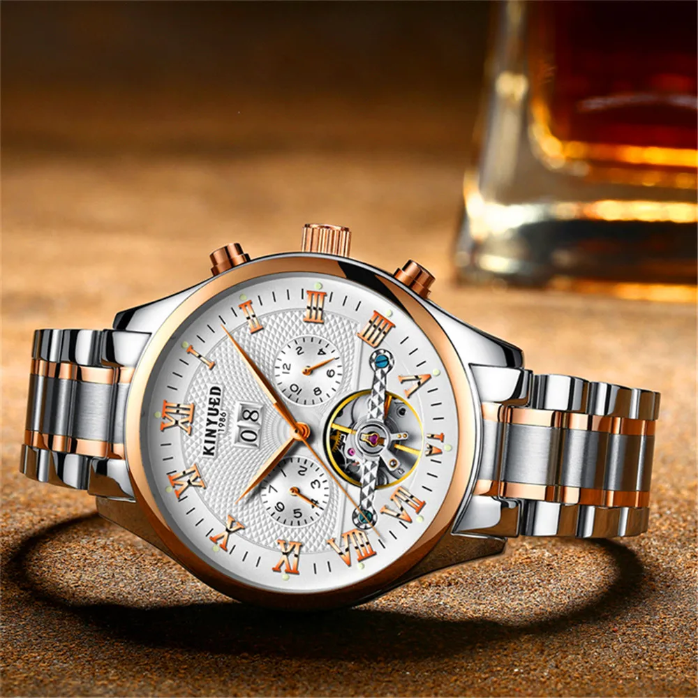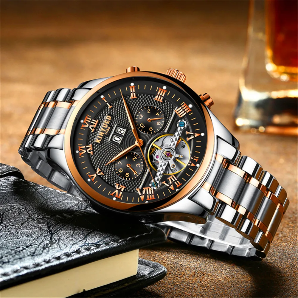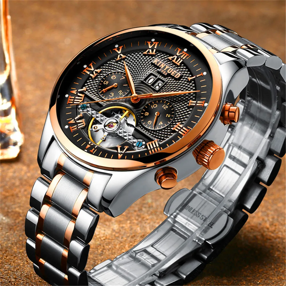Новые модные многофункциональные мужские часы KINYUED из нержавеющей стали, автоматические механические спортивные водонепроницаемые часы, мужские часы J012