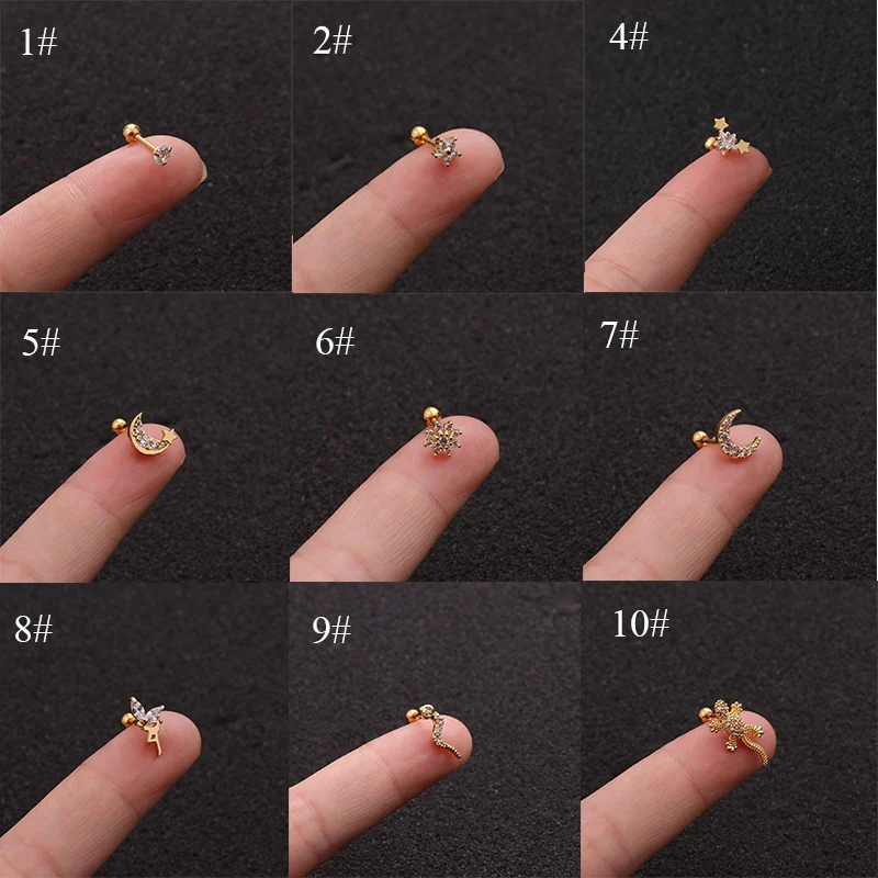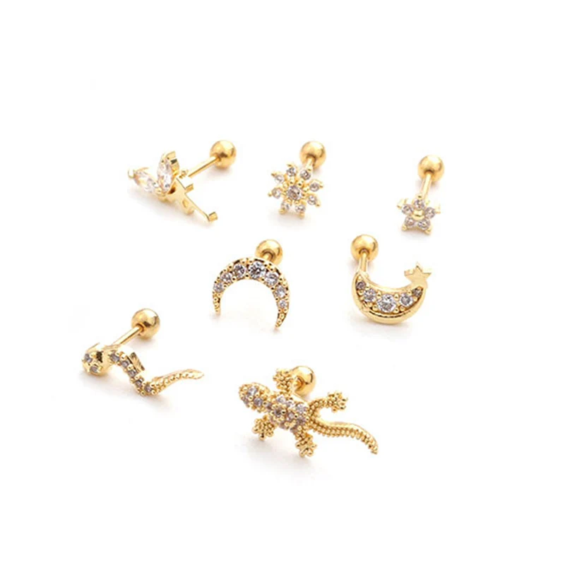 Новый стиль Нержавеющаясталь пирсинг уха серьги-гвоздики Cz Змея Ящерица Геккон Цветок Луны хрящевая спираль раковины Завинчивающаяся задняя крышка, серьги с квадратными кристаллами Настенный декор