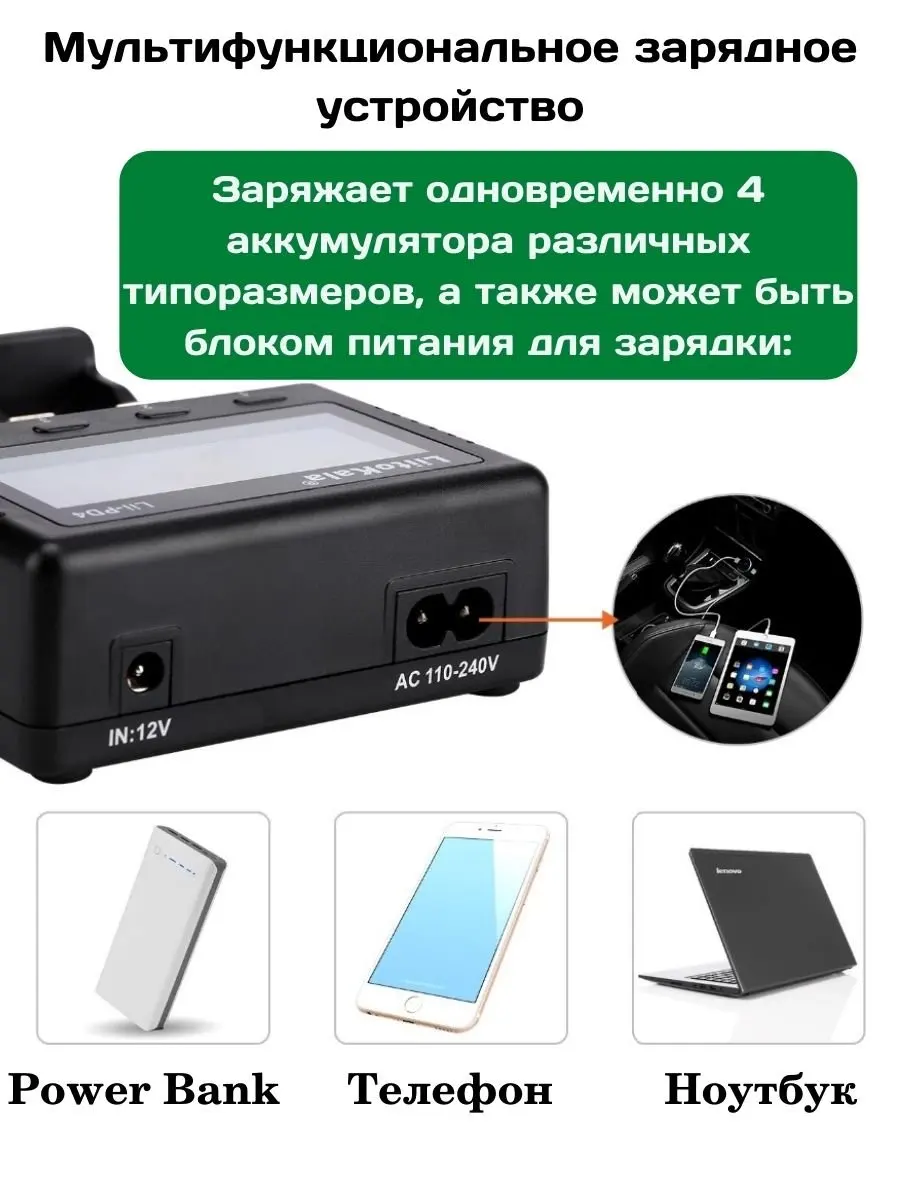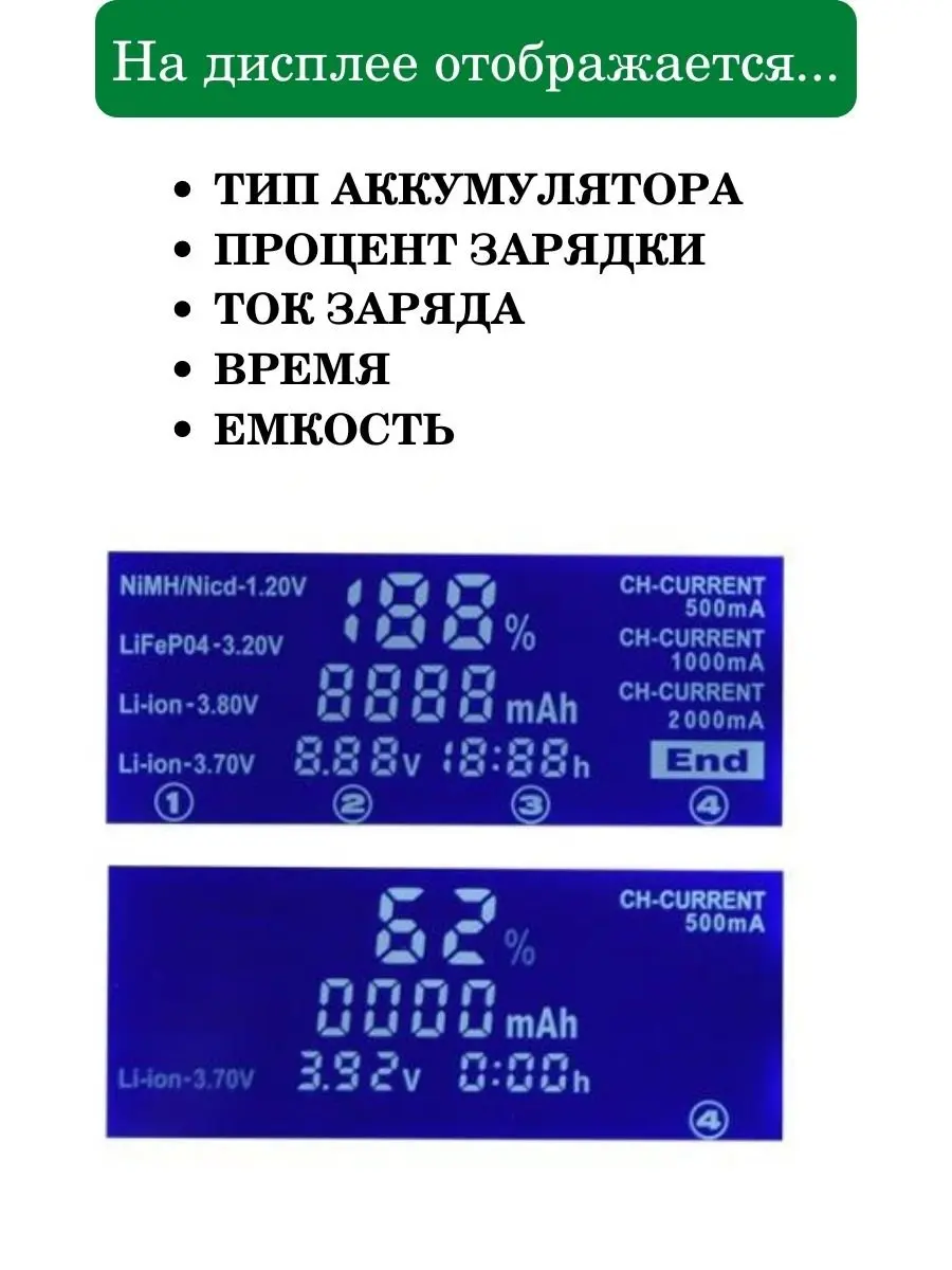 Подходит для Ni-Mh, Ni-Cd, Li-ion, LiFePO4 аккумуляторов. Типоразмеры AA, AAA, C, SC, 18650, 18490, 26650, 21700, 20700, 18350, 17670, 14500, 10440, 17500, 16340 (RCR123). Четыре слота с передвижным металличесским зажимом для установки аккумуляторов разного размера. Слоты работают независимо друг от друга с возможностью одновременного заряда разных аккумуляторов. Цифровой LED-дисплей показывает ток заряда, напряжение и тип аккумулятора. Автоматически определяет тип аккумулятора и выбирает необходимый ток заряда. Ток заряда 2000 мА, 1000 мА, 500 мА. Полная защита от перезаряда, автоматически отключается при полном заряде аккумулятора. Определяет нерабочие аккумуляторы - на дисплее появляется соответсвующая надпись. Активирует полностью разряженные аккумуляторы. Защита от переполюсовки аккумуляторов. Защита от перегрева и короткого замыкания. Работает от сети.