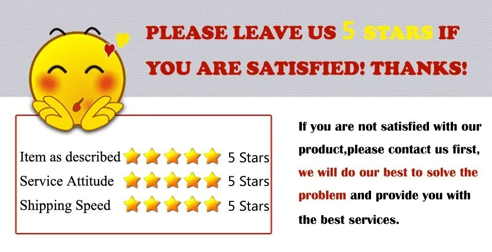 1. Если вы удовлетворены нашими продуктами и обслуживанием, пожалуйста, оставьте нам 5 звезд отзывы.