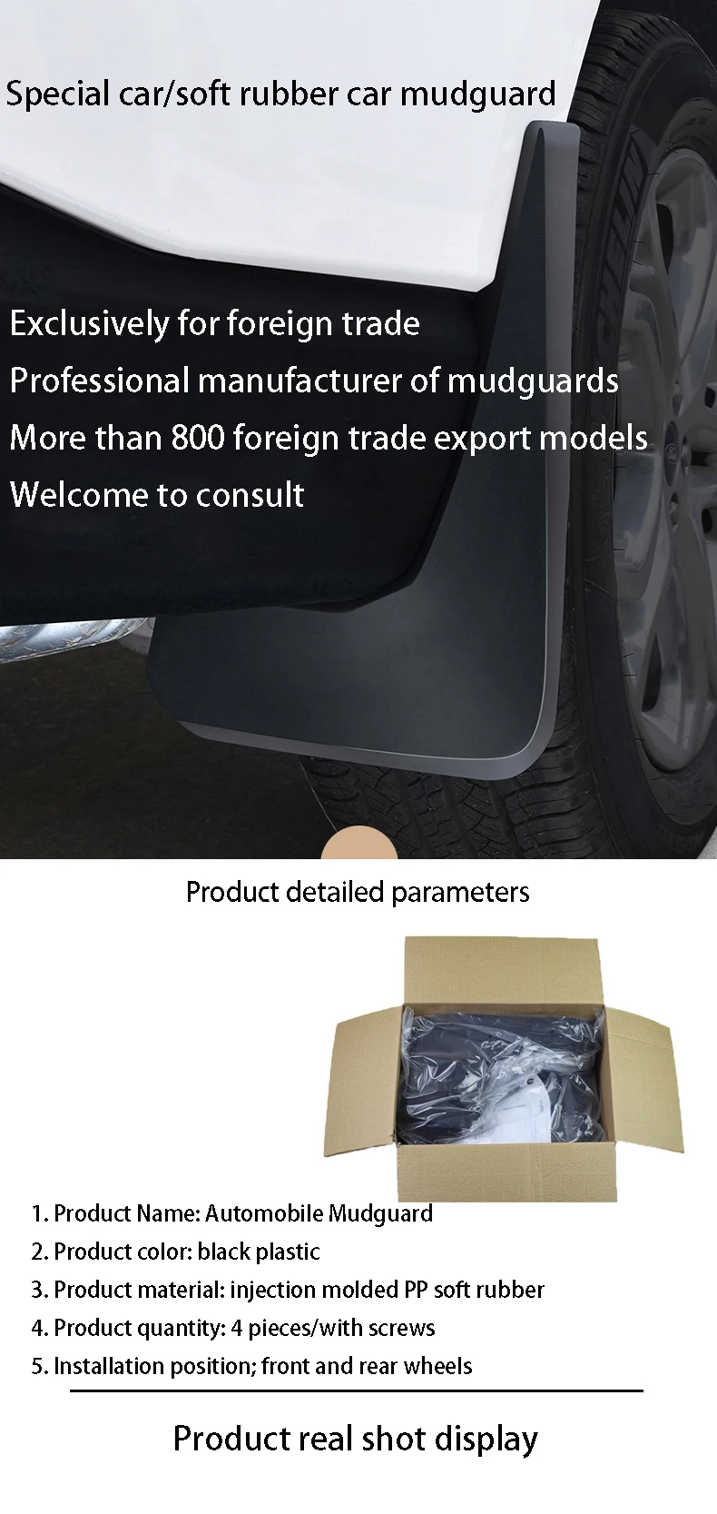 Название продукта: брызговикМатериал: импортный нейтральный пластик (ТПЭ + ПП)Цвет: черныйКоличество: 4 шт. на весь автомобиль, в упаковке саморезыПри езде по нечистым дорогам в дождливые дни тело неизбежно испачкается осадком. Если у вас есть крыло, подходящее под вашу модель, вам не нужно беспокоиться о грязной шламе в дождливые дни. Это специальное крыло для модели. Имеет простую и элегантную форму, а также простой и элегантный черный цвет. Он придаст вашему автомобилю красивый вид, сохраняя при этом чистоту вашего автомобиля.1. Описание продукта1. Используя импортный пластик (ТПЭ + ПП) в качестве сырья, он не будет слишком мягким, не деформируется при высокой температуре, не будет слишком твердым, не ломается в холодной среде, изделие будет долговечным и может использоваться в различных экологических условиях, Не меняет цвет и не деформируется.2. Импортные формы, передовая технология литья под давлением, точный размер, обтекаемый внешний вид, толщина и обработка поверхности полностью совместимы с оригинальными автомобилями, внешний вид роскошный и элегантный, долговечный, эффективно уменьшает разбрызгивание камней, мутной воды и органических веществ с колес. Поцарапайте краску и Разгладьте краску.2. Установка продукта1. Посмотрите на заднюю часть брызговика, на нем есть слова, обозначающие левую переднюю, правую переднюю, левую заднюю и правую заднюю.2. Найдите крыло в этом положении, соответствующем соответствующему колесу, поместите его в нужное положение и прикрутите саморезающим винтом (изделие оснащено винтом).Примечание:В настоящее время доступны крылья распространенных моделей на рынке.Из-за большого количества моделей изображения основного продукта предназначены только для справки. Фактическая форма и размер продукта каждой модели отличаются. Пожалуйста, укажите конкретную модель при съемке. Наша компания отправит соответствующую модель. Пожалуйста, смотрите фактический полученный товар