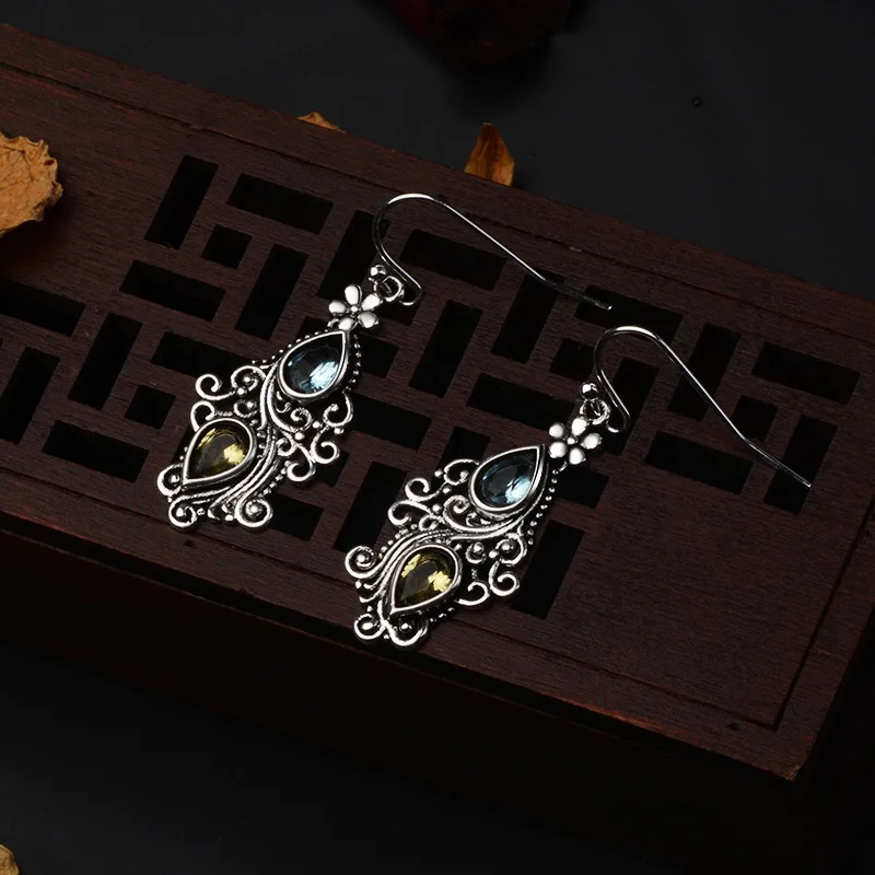 Винтажные висячие серьги в форме капли с синим и желтым цирконием д...
