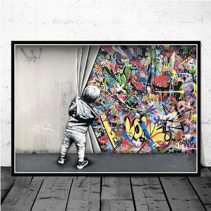 Холщовый постер Бэнкси стрит с изображением граффити за занавеской ...