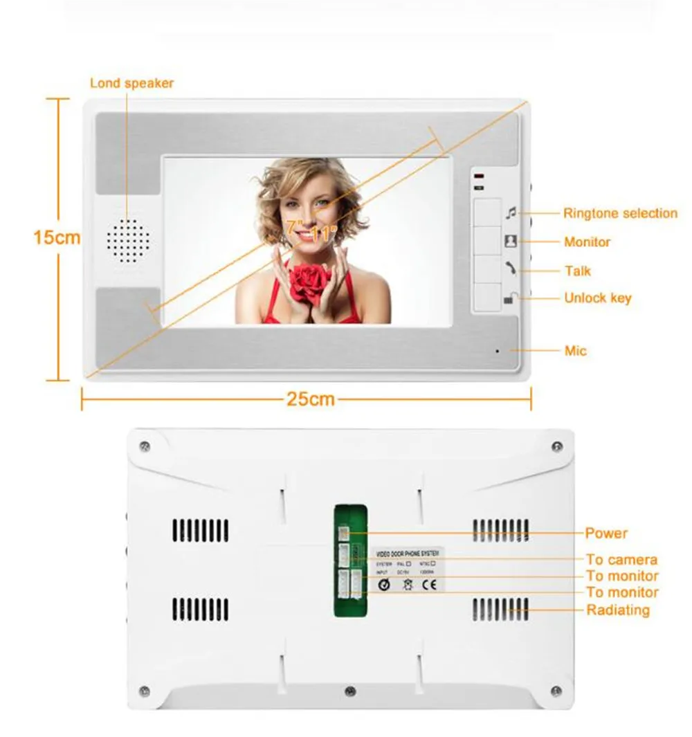 Панель из алюминиевого сплава внутреннего блока, модная и роскошная.Небольшой дождь и устойчивость к окислению для наружного блока из прочного алюминиевого сплава.Цветной TFT ЖК-дисплей 7 дюймов без излучения, низкое энергопотребление и высокое разрешение.ИК камера с ночным видением.Функция электроблокировки-управления.Гарнитура громкой связи.Функция бесшумной внутренней связи.Наблюдение за внешней стороной двери.16 видов дверных звонков.Объем, яркость и контрастность регулируются.Простая установка самостоятельно с помощью адаптера и кабеля, которые мы предоставляем в этом комплекте.