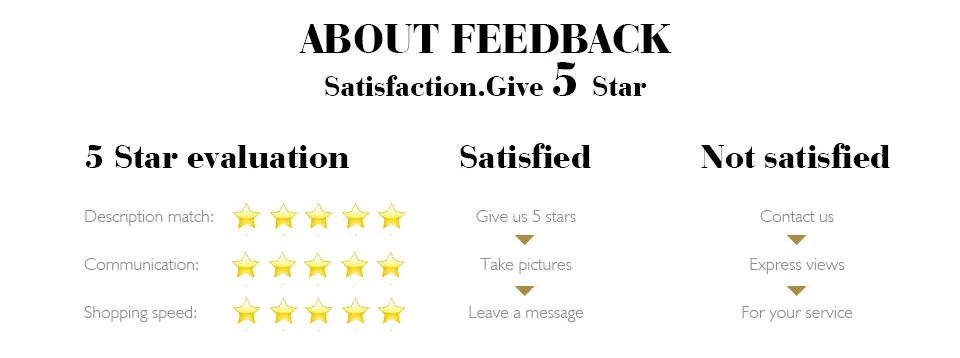 5 звезд важны для нас, поэтому мы благодарим Вас за 5 звезд. 1. Если у вас есть какие-либо вопросы с нашими товарами или услугами, пожалуйста, не стесняйтесь связаться с нами, прежде чем вы оставите отрицательный отзыв. Мы сделаем все возможное, чтобы решить ваши вопросы, пока вы не будете удовлетворены. 2. Ваше удовлетворение и положительные отзывы очень важны для нас, поэтому, пожалуйста, оставьте положительные отзывы и 5 звезд, если вы удовлетворены нашими услугами и товарами.