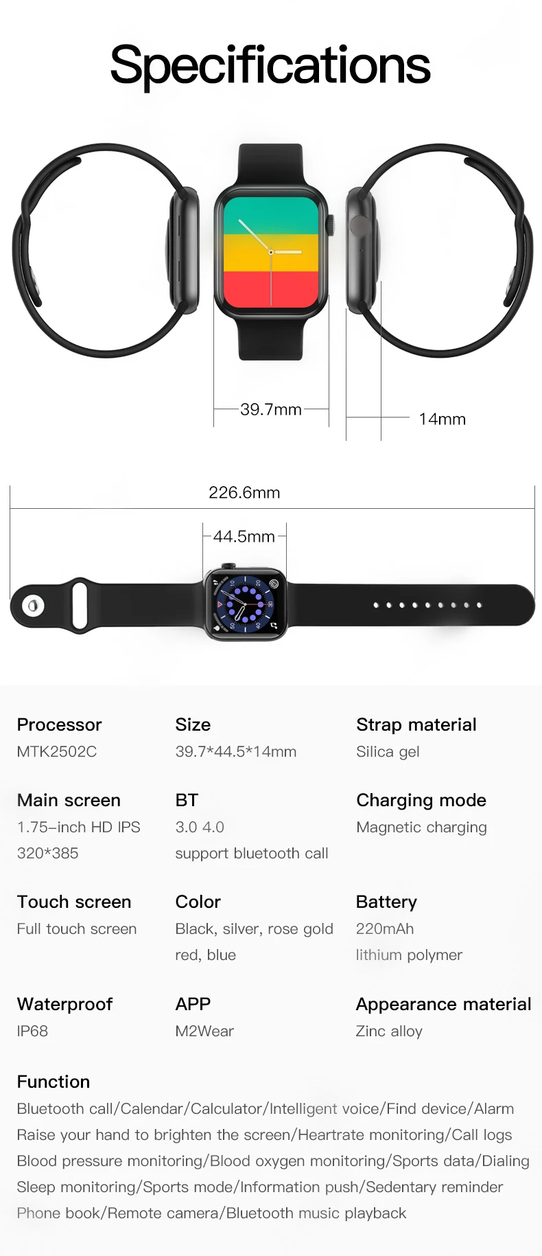 Производитель чипов: MTK Чип: 2502C Приложение: M2Wear Совместимая система: Android 5,0 или выше IOS9.0 или выше Флэш-память: 128 Мб Размер экрана: 1,75 Разрешение: IPS 320*385 Тип сенсорного экрана: полноразмерный сенсорный экран HD Bluetooth: 3,0/4,0 Батарея: полимерная литиевая батарея Ёмкость: 3,7 V/195mAh Способ зарядки: Магнитная Подставка для зарядки Время зарядки: 1,5 ч Срок службы: 3-5 дней