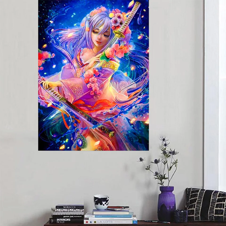 Алмазная картина Девочка-воин синего цвета, полная, квадратная, кру...