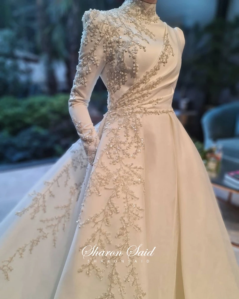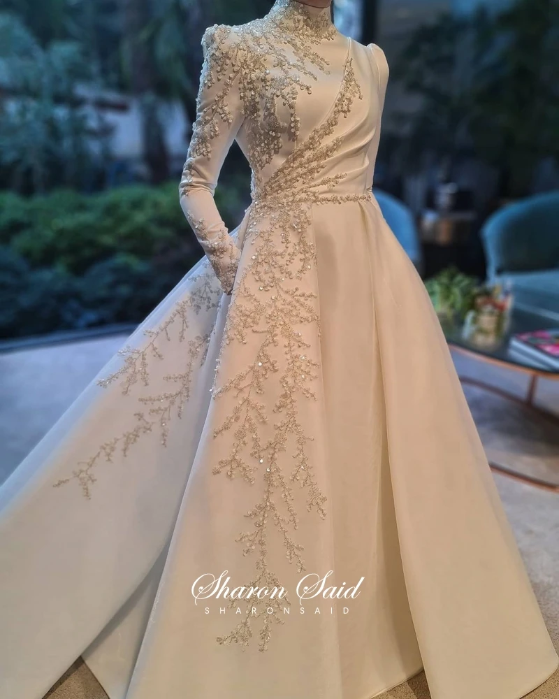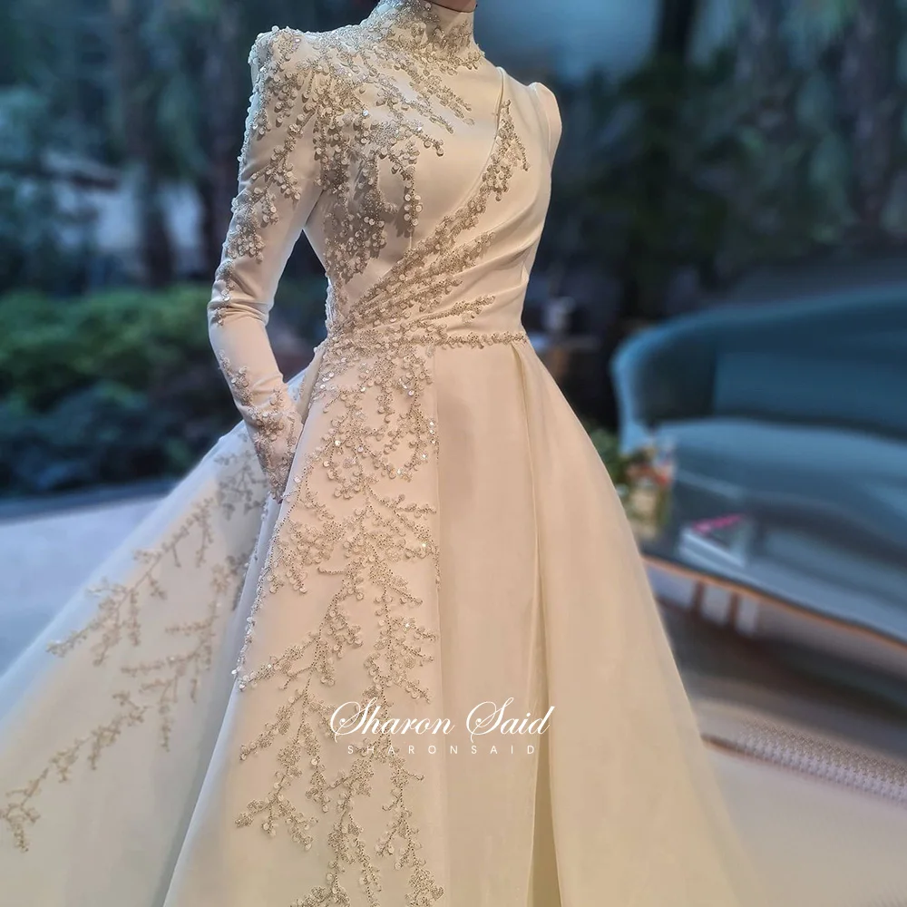 Роскошное белое мусульманское вечернее платье для женщин Свадебное платье арабское, с длинными рукавами с высоким вырезом и бисером